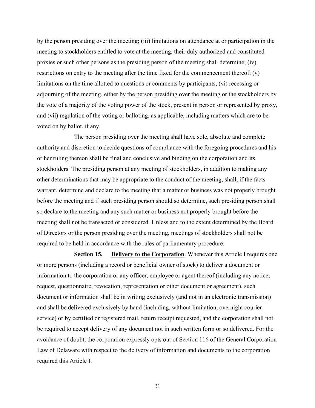 31 by the person presiding over the meeting; (iii) limitations on attendance at or participation in the meeting to stockholders entitled to vote at the meeting, their duly authorized and constituted proxies or such other persons as the presiding person of the meeting shall determine; (iv) restrictions on entry to the meeting after the time fixed for the commencement thereof; (v) limitations on the time allotted to questions or comments by participants, (vi) recessing or adjourning of the meeting, either by the person presiding over the meeting or the stockholders by the vote of a majority of the voting power of the stock, present in person or represented by proxy, and (vii) regulation of the voting or balloting, as applicable, including matters which are to be voted on by ballot, if any. The person presiding over the meeting shall have sole, absolute and complete authority and discretion to decide questions of compliance with the foregoing procedures and his or her ruling thereon shall be final and conclusive and binding on the corporation and its stockholders. The presiding person at any meeting of stockholders, in addition to making any other determinations that may be appropriate to the conduct of the meeting, shall, if the facts warrant, determine and declare to the meeting that a matter or business was not properly brought before the meeting and if such presiding person should so determine, such presiding person shall so declare to the meeting and any such matter or business not properly brought before the meeting shall not be transacted or considered. Unless and to the extent determined by the Board of Directors or the person presiding over the meeting, meetings of stockholders shall not be required to be held in accordance with the rules of parliamentary procedure. Section 15. Delivery to the Corporation. Whenever this Article I requires one or more persons (including a record or beneficial owner of stock) to deliver a document or information to the corporation or any officer, employee or agent thereof (including any notice, request, questionnaire, revocation, representation or other document or agreement), such document or information shall be in writing exclusively (and not in an electronic transmission) and shall be delivered exclusively by hand (including, without limitation, overnight courier service) or by certified or registered mail, return receipt requested, and the corporation shall not be required to accept delivery of any document not in such written form or so delivered. For the avoidance of doubt, the corporation expressly opts out of Section 116 of the General Corporation Law of Delaware with respect to the delivery of information and documents to the corporation required this Article I.