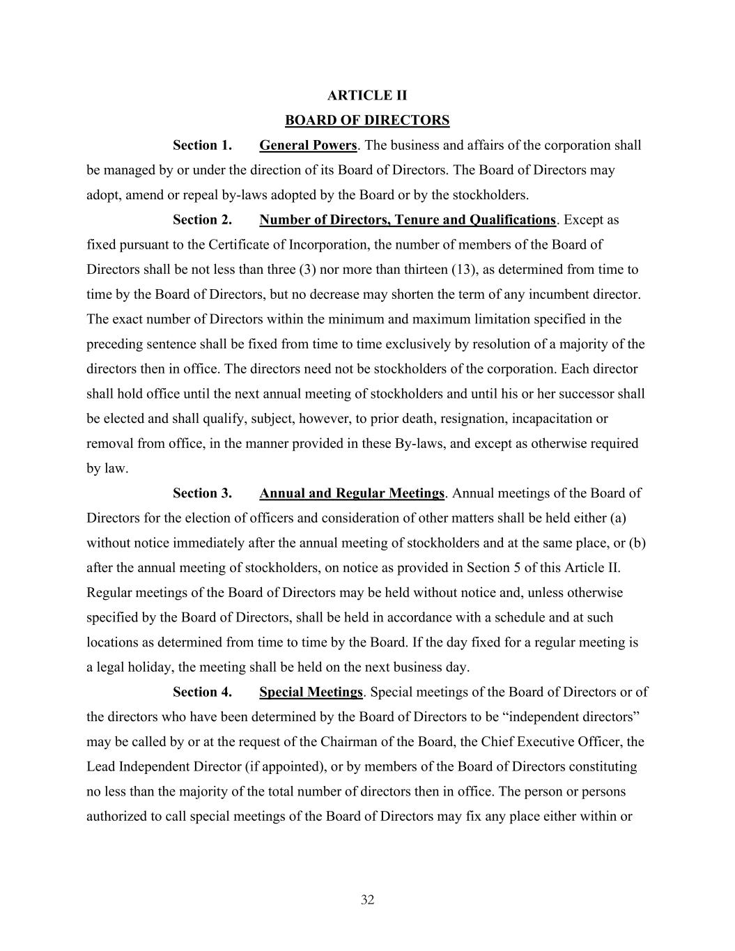 32 ARTICLE II BOARD OF DIRECTORS Section 1. General Powers. The business and affairs of the corporation shall be managed by or under the direction of its Board of Directors. The Board of Directors may adopt, amend or repeal by-laws adopted by the Board or by the stockholders. Section 2. Number of Directors, Tenure and Qualifications. Except as fixed pursuant to the Certificate of Incorporation, the number of members of the Board of Directors shall be not less than three (3) nor more than thirteen (13), as determined from time to time by the Board of Directors, but no decrease may shorten the term of any incumbent director. The exact number of Directors within the minimum and maximum limitation specified in the preceding sentence shall be fixed from time to time exclusively by resolution of a majority of the directors then in office. The directors need not be stockholders of the corporation. Each director shall hold office until the next annual meeting of stockholders and until his or her successor shall be elected and shall qualify, subject, however, to prior death, resignation, incapacitation or removal from office, in the manner provided in these By-laws, and except as otherwise required by law. Section 3. Annual and Regular Meetings. Annual meetings of the Board of Directors for the election of officers and consideration of other matters shall be held either (a) without notice immediately after the annual meeting of stockholders and at the same place, or (b) after the annual meeting of stockholders, on notice as provided in Section 5 of this Article II. Regular meetings of the Board of Directors may be held without notice and, unless otherwise specified by the Board of Directors, shall be held in accordance with a schedule and at such locations as determined from time to time by the Board. If the day fixed for a regular meeting is a legal holiday, the meeting shall be held on the next business day. Section 4. Special Meetings. Special meetings of the Board of Directors or of the directors who have been determined by the Board of Directors to be “independent directors” may be called by or at the request of the Chairman of the Board, the Chief Executive Officer, the Lead Independent Director (if appointed), or by members of the Board of Directors constituting no less than the majority of the total number of directors then in office. The person or persons authorized to call special meetings of the Board of Directors may fix any place either within or