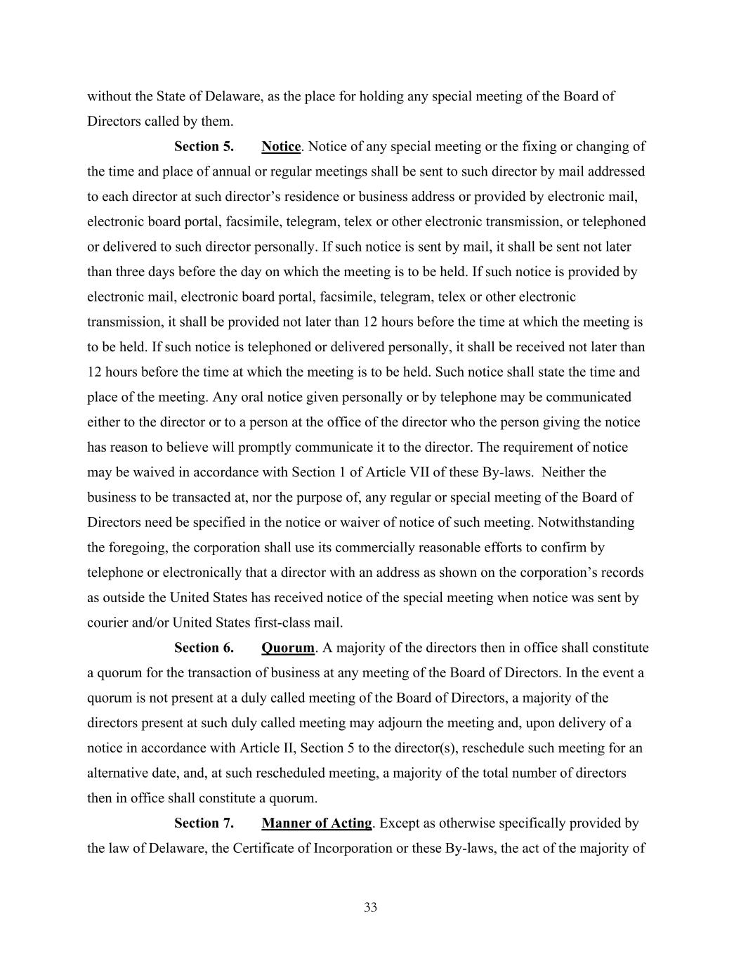 33 without the State of Delaware, as the place for holding any special meeting of the Board of Directors called by them. Section 5. Notice. Notice of any special meeting or the fixing or changing of the time and place of annual or regular meetings shall be sent to such director by mail addressed to each director at such director’s residence or business address or provided by electronic mail, electronic board portal, facsimile, telegram, telex or other electronic transmission, or telephoned or delivered to such director personally. If such notice is sent by mail, it shall be sent not later than three days before the day on which the meeting is to be held. If such notice is provided by electronic mail, electronic board portal, facsimile, telegram, telex or other electronic transmission, it shall be provided not later than 12 hours before the time at which the meeting is to be held. If such notice is telephoned or delivered personally, it shall be received not later than 12 hours before the time at which the meeting is to be held. Such notice shall state the time and place of the meeting. Any oral notice given personally or by telephone may be communicated either to the director or to a person at the office of the director who the person giving the notice has reason to believe will promptly communicate it to the director. The requirement of notice may be waived in accordance with Section 1 of Article VII of these By-laws. Neither the business to be transacted at, nor the purpose of, any regular or special meeting of the Board of Directors need be specified in the notice or waiver of notice of such meeting. Notwithstanding the foregoing, the corporation shall use its commercially reasonable efforts to confirm by telephone or electronically that a director with an address as shown on the corporation’s records as outside the United States has received notice of the special meeting when notice was sent by courier and/or United States first-class mail. Section 6. Quorum. A majority of the directors then in office shall constitute a quorum for the transaction of business at any meeting of the Board of Directors. In the event a quorum is not present at a duly called meeting of the Board of Directors, a majority of the directors present at such duly called meeting may adjourn the meeting and, upon delivery of a notice in accordance with Article II, Section 5 to the director(s), reschedule such meeting for an alternative date, and, at such rescheduled meeting, a majority of the total number of directors then in office shall constitute a quorum. Section 7. Manner of Acting. Except as otherwise specifically provided by the law of Delaware, the Certificate of Incorporation or these By-laws, the act of the majority of