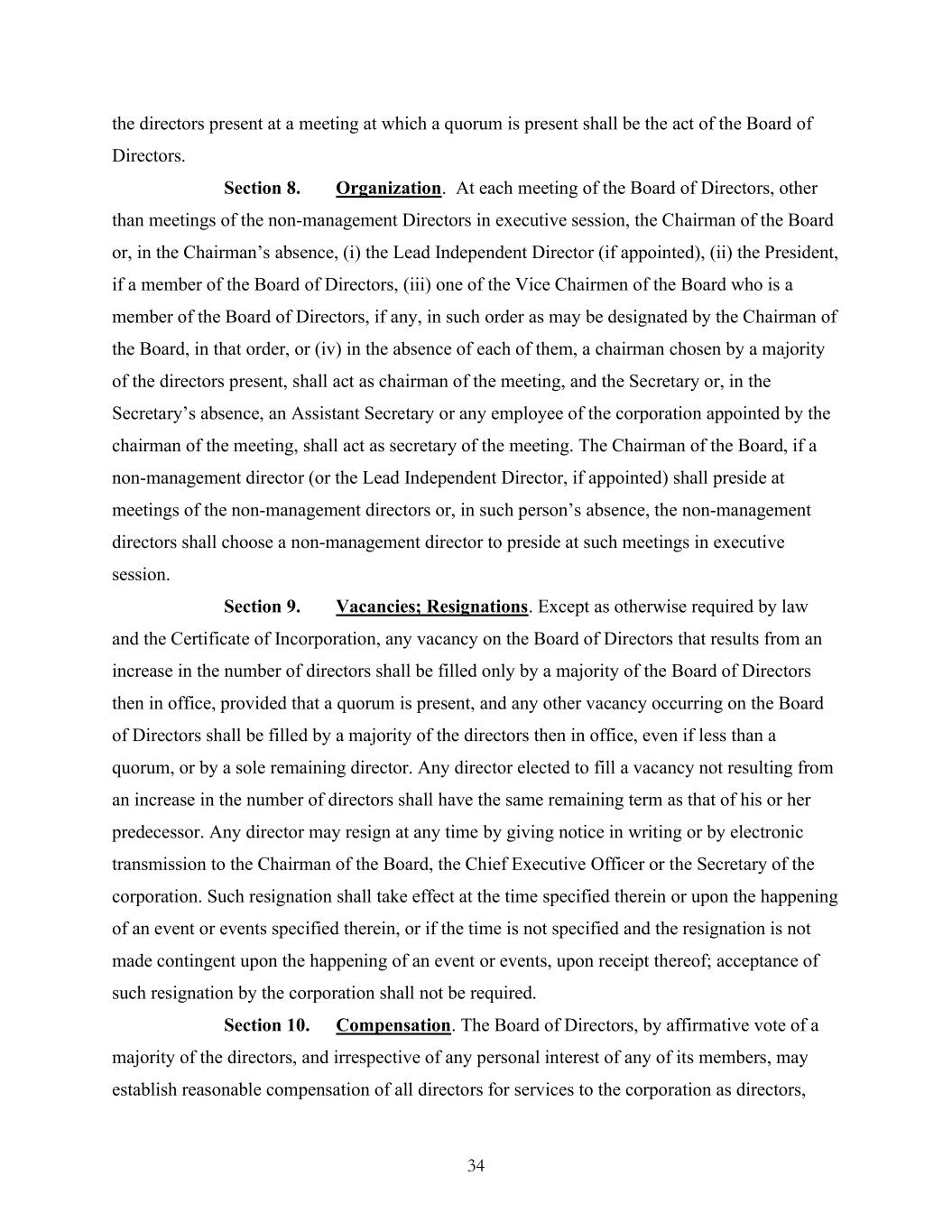 34 the directors present at a meeting at which a quorum is present shall be the act of the Board of Directors. Section 8. Organization. At each meeting of the Board of Directors, other than meetings of the non-management Directors in executive session, the Chairman of the Board or, in the Chairman’s absence, (i) the Lead Independent Director (if appointed), (ii) the President, if a member of the Board of Directors, (iii) one of the Vice Chairmen of the Board who is a member of the Board of Directors, if any, in such order as may be designated by the Chairman of the Board, in that order, or (iv) in the absence of each of them, a chairman chosen by a majority of the directors present, shall act as chairman of the meeting, and the Secretary or, in the Secretary’s absence, an Assistant Secretary or any employee of the corporation appointed by the chairman of the meeting, shall act as secretary of the meeting. The Chairman of the Board, if a non-management director (or the Lead Independent Director, if appointed) shall preside at meetings of the non-management directors or, in such person’s absence, the non-management directors shall choose a non-management director to preside at such meetings in executive session. Section 9. Vacancies; Resignations. Except as otherwise required by law and the Certificate of Incorporation, any vacancy on the Board of Directors that results from an increase in the number of directors shall be filled only by a majority of the Board of Directors then in office, provided that a quorum is present, and any other vacancy occurring on the Board of Directors shall be filled by a majority of the directors then in office, even if less than a quorum, or by a sole remaining director. Any director elected to fill a vacancy not resulting from an increase in the number of directors shall have the same remaining term as that of his or her predecessor. Any director may resign at any time by giving notice in writing or by electronic transmission to the Chairman of the Board, the Chief Executive Officer or the Secretary of the corporation. Such resignation shall take effect at the time specified therein or upon the happening of an event or events specified therein, or if the time is not specified and the resignation is not made contingent upon the happening of an event or events, upon receipt thereof; acceptance of such resignation by the corporation shall not be required. Section 10. Compensation. The Board of Directors, by affirmative vote of a majority of the directors, and irrespective of any personal interest of any of its members, may establish reasonable compensation of all directors for services to the corporation as directors,