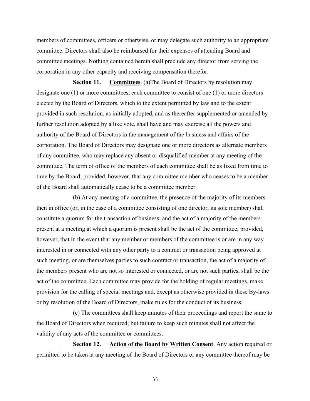 35 members of committees, officers or otherwise, or may delegate such authority to an appropriate committee. Directors shall also be reimbursed for their expenses of attending Board and committee meetings. Nothing contained herein shall preclude any director from serving the corporation in any other capacity and receiving compensation therefor. Section 11. Committees. (a)The Board of Directors by resolution may designate one (1) or more committees, each committee to consist of one (1) or more directors elected by the Board of Directors, which to the extent permitted by law and to the extent provided in such resolution, as initially adopted, and as thereafter supplemented or amended by further resolution adopted by a like vote, shall have and may exercise all the powers and authority of the Board of Directors in the management of the business and affairs of the corporation. The Board of Directors may designate one or more directors as alternate members of any committee, who may replace any absent or disqualified member at any meeting of the committee. The term of office of the members of each committee shall be as fixed from time to time by the Board; provided, however, that any committee member who ceases to be a member of the Board shall automatically cease to be a committee member. (b) At any meeting of a committee, the presence of the majority of its members then in office (or, in the case of a committee consisting of one director, its sole member) shall constitute a quorum for the transaction of business; and the act of a majority of the members present at a meeting at which a quorum is present shall be the act of the committee; provided, however, that in the event that any member or members of the committee is or are in any way interested in or connected with any other party to a contract or transaction being approved at such meeting, or are themselves parties to such contract or transaction, the act of a majority of the members present who are not so interested or connected, or are not such parties, shall be the act of the committee. Each committee may provide for the holding of regular meetings, make provision for the calling of special meetings and, except as otherwise provided in these By-laws or by resolution of the Board of Directors, make rules for the conduct of its business. (c) The committees shall keep minutes of their proceedings and report the same to the Board of Directors when required; but failure to keep such minutes shall not affect the validity of any acts of the committee or committees. Section 12. Action of the Board by Written Consent. Any action required or permitted to be taken at any meeting of the Board of Directors or any committee thereof may be