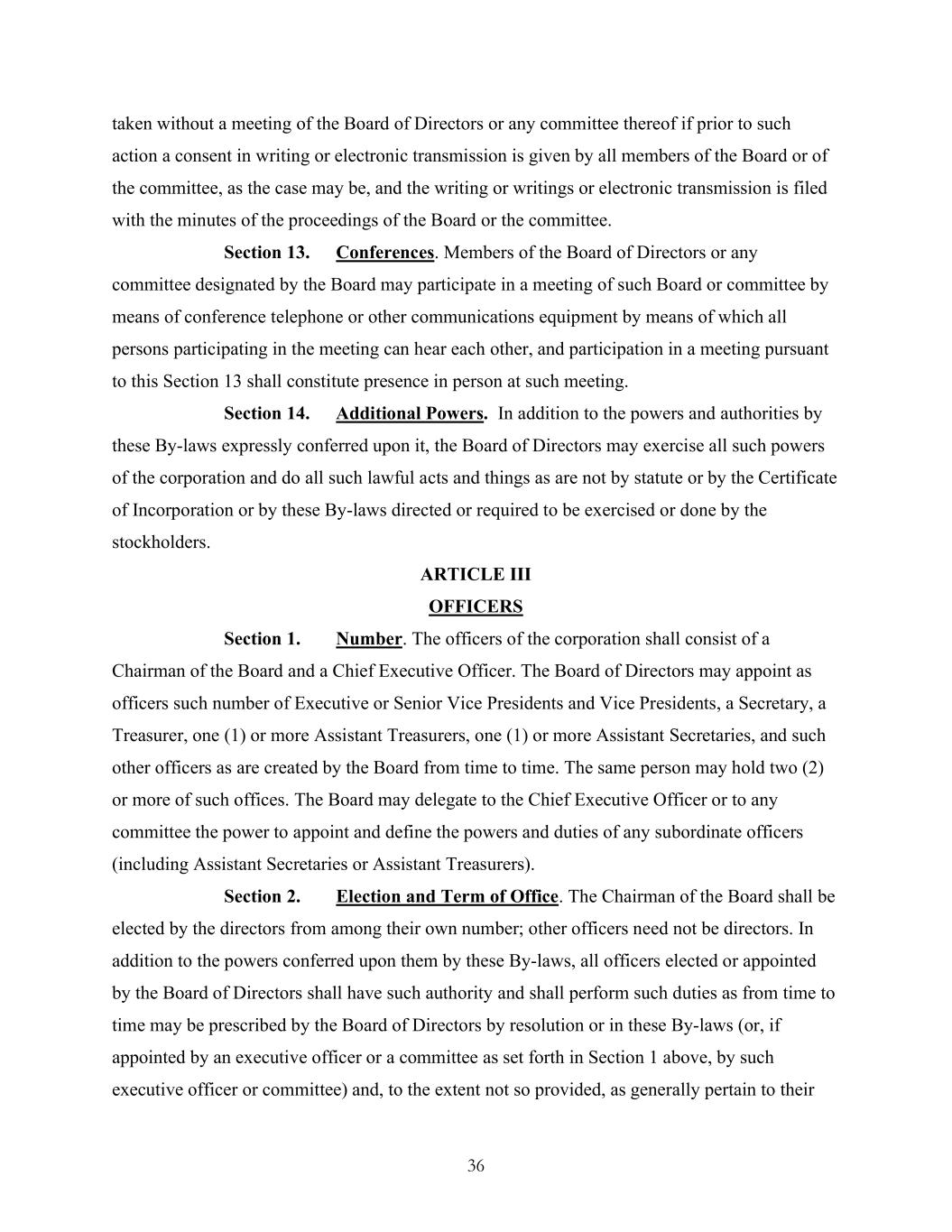 36 taken without a meeting of the Board of Directors or any committee thereof if prior to such action a consent in writing or electronic transmission is given by all members of the Board or of the committee, as the case may be, and the writing or writings or electronic transmission is filed with the minutes of the proceedings of the Board or the committee. Section 13. Conferences. Members of the Board of Directors or any committee designated by the Board may participate in a meeting of such Board or committee by means of conference telephone or other communications equipment by means of which all persons participating in the meeting can hear each other, and participation in a meeting pursuant to this Section 13 shall constitute presence in person at such meeting. Section 14. Additional Powers. In addition to the powers and authorities by these By-laws expressly conferred upon it, the Board of Directors may exercise all such powers of the corporation and do all such lawful acts and things as are not by statute or by the Certificate of Incorporation or by these By-laws directed or required to be exercised or done by the stockholders. ARTICLE III OFFICERS Section 1. Number. The officers of the corporation shall consist of a Chairman of the Board and a Chief Executive Officer. The Board of Directors may appoint as officers such number of Executive or Senior Vice Presidents and Vice Presidents, a Secretary, a Treasurer, one (1) or more Assistant Treasurers, one (1) or more Assistant Secretaries, and such other officers as are created by the Board from time to time. The same person may hold two (2) or more of such offices. The Board may delegate to the Chief Executive Officer or to any committee the power to appoint and define the powers and duties of any subordinate officers (including Assistant Secretaries or Assistant Treasurers). Section 2. Election and Term of Office. The Chairman of the Board shall be elected by the directors from among their own number; other officers need not be directors. In addition to the powers conferred upon them by these By-laws, all officers elected or appointed by the Board of Directors shall have such authority and shall perform such duties as from time to time may be prescribed by the Board of Directors by resolution or in these By-laws (or, if appointed by an executive officer or a committee as set forth in Section 1 above, by such executive officer or committee) and, to the extent not so provided, as generally pertain to their