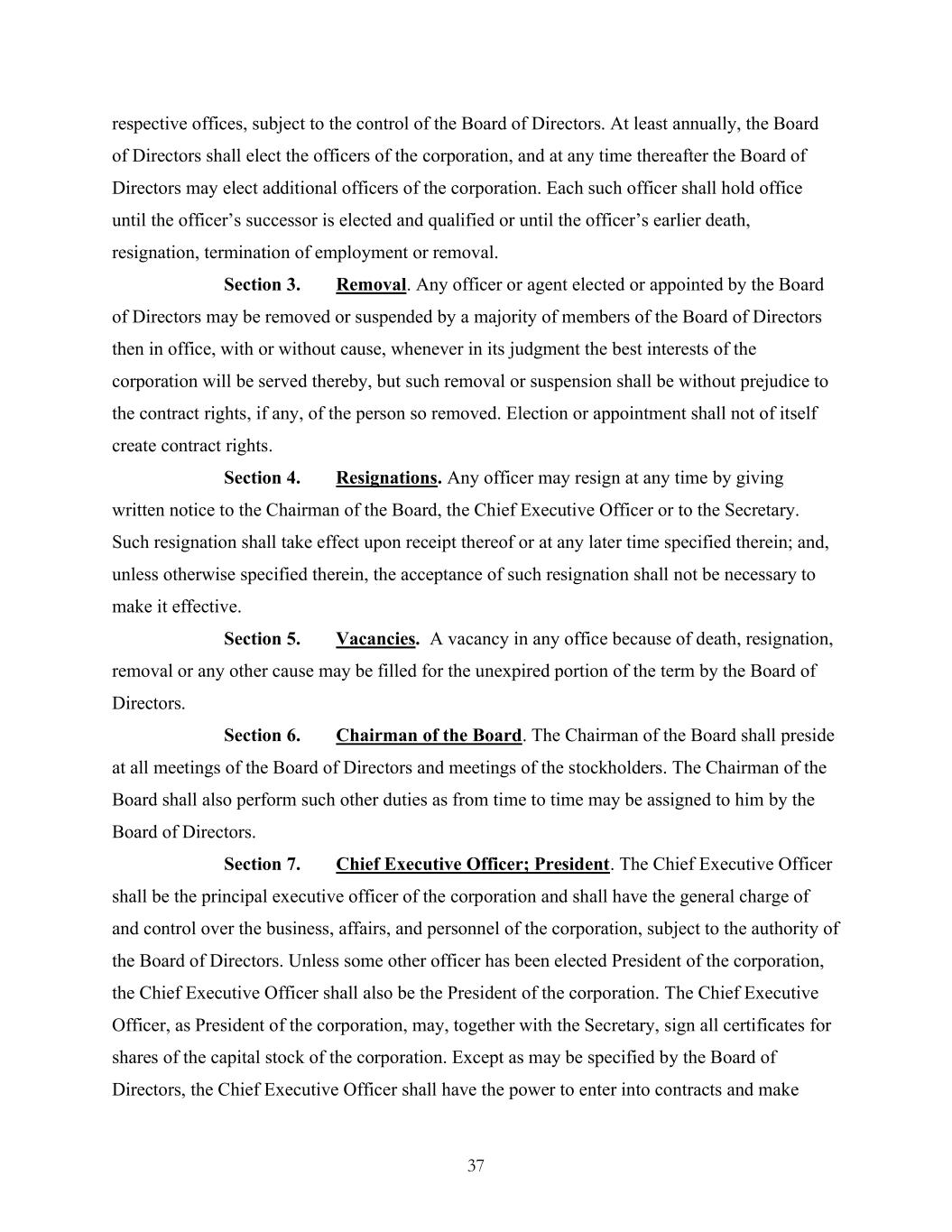 37 respective offices, subject to the control of the Board of Directors. At least annually, the Board of Directors shall elect the officers of the corporation, and at any time thereafter the Board of Directors may elect additional officers of the corporation. Each such officer shall hold office until the officer’s successor is elected and qualified or until the officer’s earlier death, resignation, termination of employment or removal. Section 3. Removal. Any officer or agent elected or appointed by the Board of Directors may be removed or suspended by a majority of members of the Board of Directors then in office, with or without cause, whenever in its judgment the best interests of the corporation will be served thereby, but such removal or suspension shall be without prejudice to the contract rights, if any, of the person so removed. Election or appointment shall not of itself create contract rights. Section 4. Resignations. Any officer may resign at any time by giving written notice to the Chairman of the Board, the Chief Executive Officer or to the Secretary. Such resignation shall take effect upon receipt thereof or at any later time specified therein; and, unless otherwise specified therein, the acceptance of such resignation shall not be necessary to make it effective. Section 5. Vacancies. A vacancy in any office because of death, resignation, removal or any other cause may be filled for the unexpired portion of the term by the Board of Directors. Section 6. Chairman of the Board. The Chairman of the Board shall preside at all meetings of the Board of Directors and meetings of the stockholders. The Chairman of the Board shall also perform such other duties as from time to time may be assigned to him by the Board of Directors. Section 7. Chief Executive Officer; President. The Chief Executive Officer shall be the principal executive officer of the corporation and shall have the general charge of and control over the business, affairs, and personnel of the corporation, subject to the authority of the Board of Directors. Unless some other officer has been elected President of the corporation, the Chief Executive Officer shall also be the President of the corporation. The Chief Executive Officer, as President of the corporation, may, together with the Secretary, sign all certificates for shares of the capital stock of the corporation. Except as may be specified by the Board of Directors, the Chief Executive Officer shall have the power to enter into contracts and make