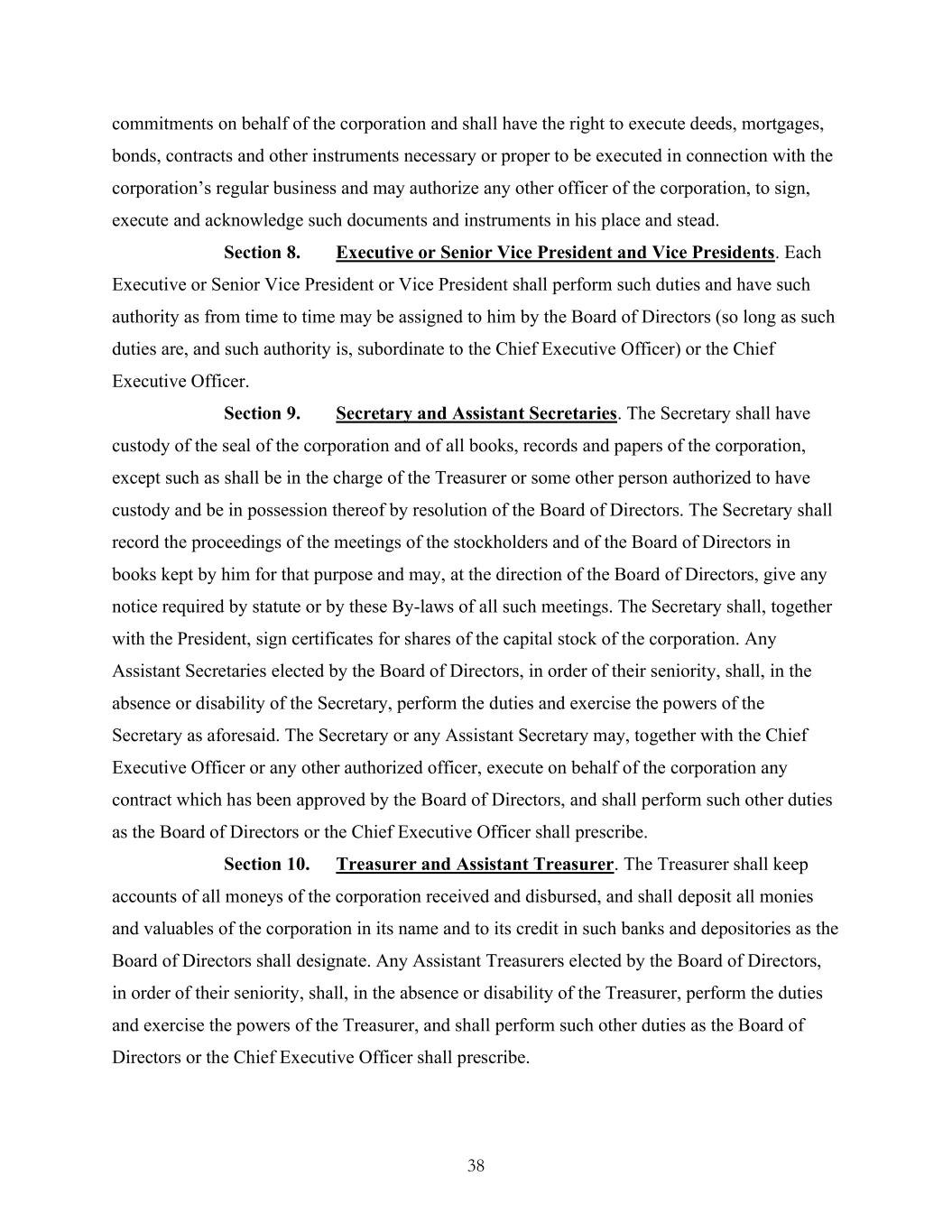 38 commitments on behalf of the corporation and shall have the right to execute deeds, mortgages, bonds, contracts and other instruments necessary or proper to be executed in connection with the corporation’s regular business and may authorize any other officer of the corporation, to sign, execute and acknowledge such documents and instruments in his place and stead. Section 8. Executive or Senior Vice President and Vice Presidents. Each Executive or Senior Vice President or Vice President shall perform such duties and have such authority as from time to time may be assigned to him by the Board of Directors (so long as such duties are, and such authority is, subordinate to the Chief Executive Officer) or the Chief Executive Officer. Section 9. Secretary and Assistant Secretaries. The Secretary shall have custody of the seal of the corporation and of all books, records and papers of the corporation, except such as shall be in the charge of the Treasurer or some other person authorized to have custody and be in possession thereof by resolution of the Board of Directors. The Secretary shall record the proceedings of the meetings of the stockholders and of the Board of Directors in books kept by him for that purpose and may, at the direction of the Board of Directors, give any notice required by statute or by these By-laws of all such meetings. The Secretary shall, together with the President, sign certificates for shares of the capital stock of the corporation. Any Assistant Secretaries elected by the Board of Directors, in order of their seniority, shall, in the absence or disability of the Secretary, perform the duties and exercise the powers of the Secretary as aforesaid. The Secretary or any Assistant Secretary may, together with the Chief Executive Officer or any other authorized officer, execute on behalf of the corporation any contract which has been approved by the Board of Directors, and shall perform such other duties as the Board of Directors or the Chief Executive Officer shall prescribe. Section 10. Treasurer and Assistant Treasurer. The Treasurer shall keep accounts of all moneys of the corporation received and disbursed, and shall deposit all monies and valuables of the corporation in its name and to its credit in such banks and depositories as the Board of Directors shall designate. Any Assistant Treasurers elected by the Board of Directors, in order of their seniority, shall, in the absence or disability of the Treasurer, perform the duties and exercise the powers of the Treasurer, and shall perform such other duties as the Board of Directors or the Chief Executive Officer shall prescribe.