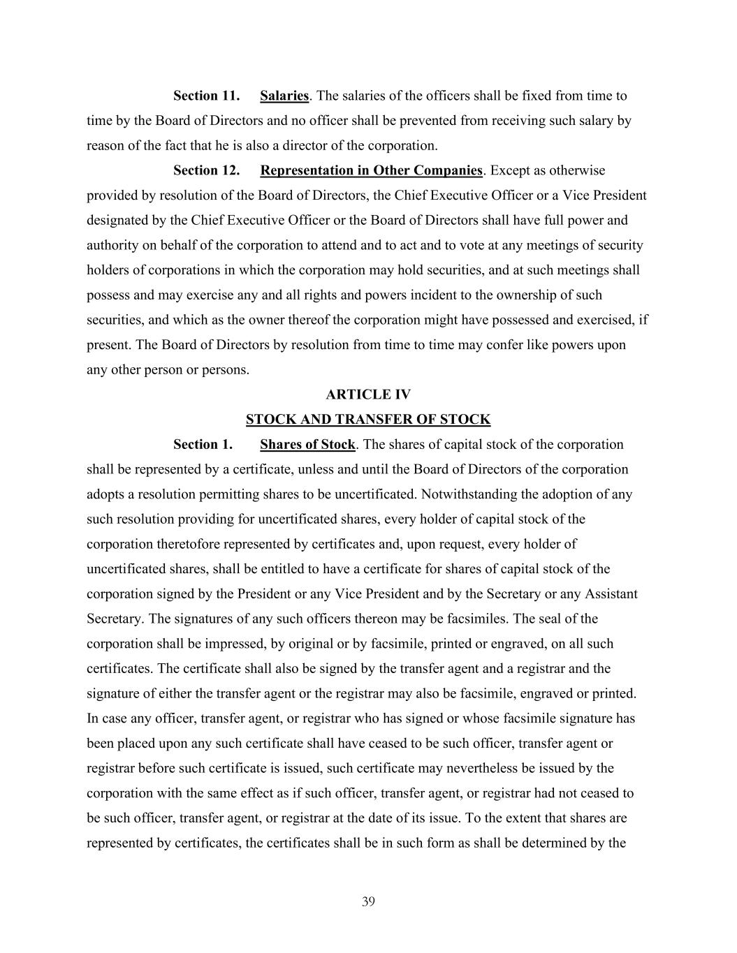 39 Section 11. Salaries. The salaries of the officers shall be fixed from time to time by the Board of Directors and no officer shall be prevented from receiving such salary by reason of the fact that he is also a director of the corporation. Section 12. Representation in Other Companies. Except as otherwise provided by resolution of the Board of Directors, the Chief Executive Officer or a Vice President designated by the Chief Executive Officer or the Board of Directors shall have full power and authority on behalf of the corporation to attend and to act and to vote at any meetings of security holders of corporations in which the corporation may hold securities, and at such meetings shall possess and may exercise any and all rights and powers incident to the ownership of such securities, and which as the owner thereof the corporation might have possessed and exercised, if present. The Board of Directors by resolution from time to time may confer like powers upon any other person or persons. ARTICLE IV STOCK AND TRANSFER OF STOCK Section 1. Shares of Stock. The shares of capital stock of the corporation shall be represented by a certificate, unless and until the Board of Directors of the corporation adopts a resolution permitting shares to be uncertificated. Notwithstanding the adoption of any such resolution providing for uncertificated shares, every holder of capital stock of the corporation theretofore represented by certificates and, upon request, every holder of uncertificated shares, shall be entitled to have a certificate for shares of capital stock of the corporation signed by the President or any Vice President and by the Secretary or any Assistant Secretary. The signatures of any such officers thereon may be facsimiles. The seal of the corporation shall be impressed, by original or by facsimile, printed or engraved, on all such certificates. The certificate shall also be signed by the transfer agent and a registrar and the signature of either the transfer agent or the registrar may also be facsimile, engraved or printed. In case any officer, transfer agent, or registrar who has signed or whose facsimile signature has been placed upon any such certificate shall have ceased to be such officer, transfer agent or registrar before such certificate is issued, such certificate may nevertheless be issued by the corporation with the same effect as if such officer, transfer agent, or registrar had not ceased to be such officer, transfer agent, or registrar at the date of its issue. To the extent that shares are represented by certificates, the certificates shall be in such form as shall be determined by the
