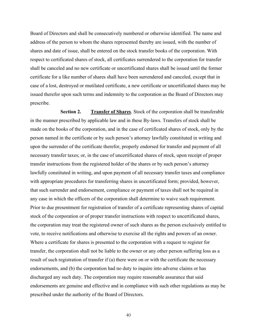 40 Board of Directors and shall be consecutively numbered or otherwise identified. The name and address of the person to whom the shares represented thereby are issued, with the number of shares and date of issue, shall be entered on the stock transfer books of the corporation. With respect to certificated shares of stock, all certificates surrendered to the corporation for transfer shall be canceled and no new certificate or uncertificated shares shall be issued until the former certificate for a like number of shares shall have been surrendered and canceled, except that in case of a lost, destroyed or mutilated certificate, a new certificate or uncertificated shares may be issued therefor upon such terms and indemnity to the corporation as the Board of Directors may prescribe. Section 2. Transfer of Shares. Stock of the corporation shall be transferable in the manner prescribed by applicable law and in these By-laws. Transfers of stock shall be made on the books of the corporation, and in the case of certificated shares of stock, only by the person named in the certificate or by such person’s attorney lawfully constituted in writing and upon the surrender of the certificate therefor, properly endorsed for transfer and payment of all necessary transfer taxes; or, in the case of uncertificated shares of stock, upon receipt of proper transfer instructions from the registered holder of the shares or by such person’s attorney lawfully constituted in writing, and upon payment of all necessary transfer taxes and compliance with appropriate procedures for transferring shares in uncertificated form; provided, however, that such surrender and endorsement, compliance or payment of taxes shall not be required in any case in which the officers of the corporation shall determine to waive such requirement. Prior to due presentment for registration of transfer of a certificate representing shares of capital stock of the corporation or of proper transfer instructions with respect to uncertificated shares, the corporation may treat the registered owner of such shares as the person exclusively entitled to vote, to receive notifications and otherwise to exercise all the rights and powers of an owner. Where a certificate for shares is presented to the corporation with a request to register for transfer, the corporation shall not be liable to the owner or any other person suffering loss as a result of such registration of transfer if (a) there were on or with the certificate the necessary endorsements, and (b) the corporation had no duty to inquire into adverse claims or has discharged any such duty. The corporation may require reasonable assurance that said endorsements are genuine and effective and in compliance with such other regulations as may be prescribed under the authority of the Board of Directors.