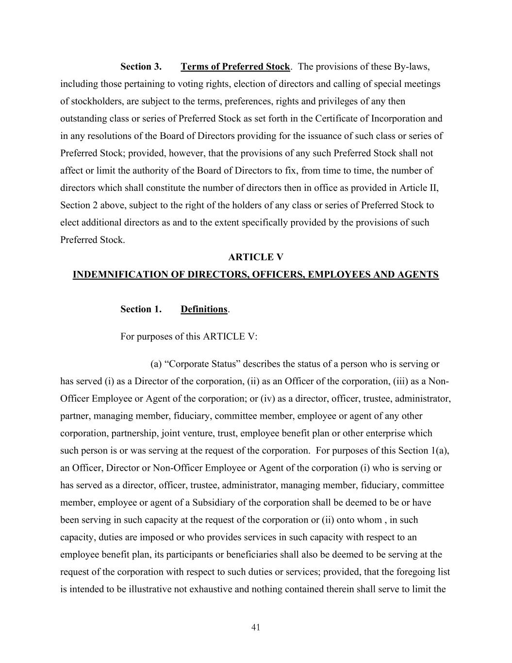 41 Section 3. Terms of Preferred Stock. The provisions of these By-laws, including those pertaining to voting rights, election of directors and calling of special meetings of stockholders, are subject to the terms, preferences, rights and privileges of any then outstanding class or series of Preferred Stock as set forth in the Certificate of Incorporation and in any resolutions of the Board of Directors providing for the issuance of such class or series of Preferred Stock; provided, however, that the provisions of any such Preferred Stock shall not affect or limit the authority of the Board of Directors to fix, from time to time, the number of directors which shall constitute the number of directors then in office as provided in Article II, Section 2 above, subject to the right of the holders of any class or series of Preferred Stock to elect additional directors as and to the extent specifically provided by the provisions of such Preferred Stock. ARTICLE V INDEMNIFICATION OF DIRECTORS, OFFICERS, EMPLOYEES AND AGENTS Section 1. Definitions. For purposes of this ARTICLE V: (a) “Corporate Status” describes the status of a person who is serving or has served (i) as a Director of the corporation, (ii) as an Officer of the corporation, (iii) as a Non- Officer Employee or Agent of the corporation; or (iv) as a director, officer, trustee, administrator, partner, managing member, fiduciary, committee member, employee or agent of any other corporation, partnership, joint venture, trust, employee benefit plan or other enterprise which such person is or was serving at the request of the corporation. For purposes of this Section 1(a), an Officer, Director or Non-Officer Employee or Agent of the corporation (i) who is serving or has served as a director, officer, trustee, administrator, managing member, fiduciary, committee member, employee or agent of a Subsidiary of the corporation shall be deemed to be or have been serving in such capacity at the request of the corporation or (ii) onto whom , in such capacity, duties are imposed or who provides services in such capacity with respect to an employee benefit plan, its participants or beneficiaries shall also be deemed to be serving at the request of the corporation with respect to such duties or services; provided, that the foregoing list is intended to be illustrative not exhaustive and nothing contained therein shall serve to limit the