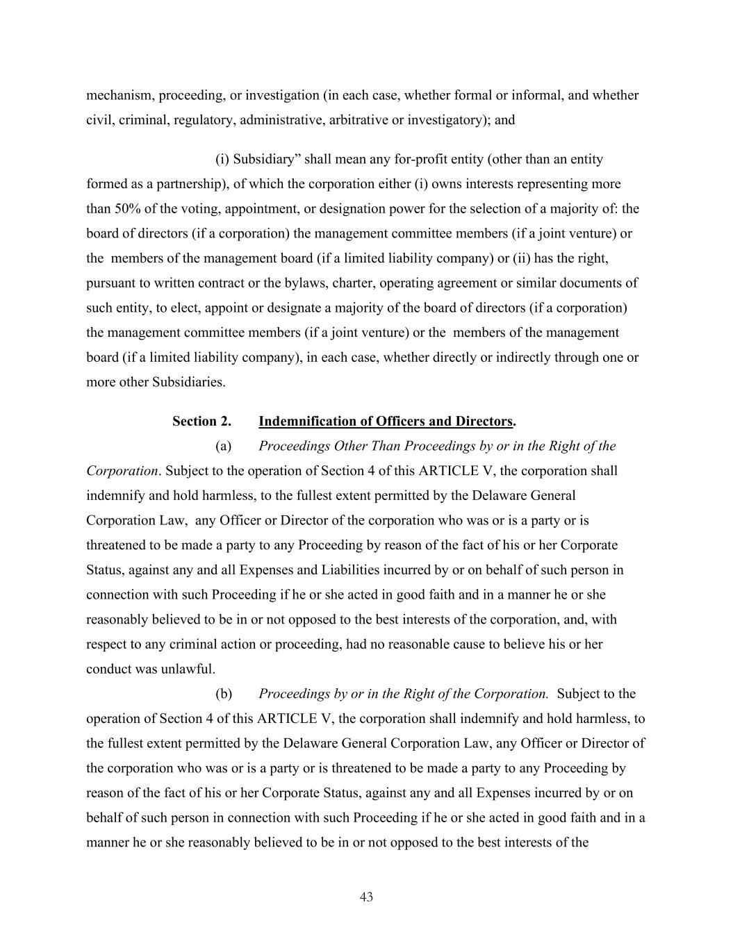 43 mechanism, proceeding, or investigation (in each case, whether formal or informal, and whether civil, criminal, regulatory, administrative, arbitrative or investigatory); and (i) Subsidiary” shall mean any for-profit entity (other than an entity formed as a partnership), of which the corporation either (i) owns interests representing more than 50% of the voting, appointment, or designation power for the selection of a majority of: the board of directors (if a corporation) the management committee members (if a joint venture) or the members of the management board (if a limited liability company) or (ii) has the right, pursuant to written contract or the bylaws, charter, operating agreement or similar documents of such entity, to elect, appoint or designate a majority of the board of directors (if a corporation) the management committee members (if a joint venture) or the members of the management board (if a limited liability company), in each case, whether directly or indirectly through one or more other Subsidiaries. Section 2. Indemnification of Officers and Directors. (a) Proceedings Other Than Proceedings by or in the Right of the Corporation. Subject to the operation of Section 4 of this ARTICLE V, the corporation shall indemnify and hold harmless, to the fullest extent permitted by the Delaware General Corporation Law, any Officer or Director of the corporation who was or is a party or is threatened to be made a party to any Proceeding by reason of the fact of his or her Corporate Status, against any and all Expenses and Liabilities incurred by or on behalf of such person in connection with such Proceeding if he or she acted in good faith and in a manner he or she reasonably believed to be in or not opposed to the best interests of the corporation, and, with respect to any criminal action or proceeding, had no reasonable cause to believe his or her conduct was unlawful. (b) Proceedings by or in the Right of the Corporation. Subject to the operation of Section 4 of this ARTICLE V, the corporation shall indemnify and hold harmless, to the fullest extent permitted by the Delaware General Corporation Law, any Officer or Director of the corporation who was or is a party or is threatened to be made a party to any Proceeding by reason of the fact of his or her Corporate Status, against any and all Expenses incurred by or on behalf of such person in connection with such Proceeding if he or she acted in good faith and in a manner he or she reasonably believed to be in or not opposed to the best interests of the