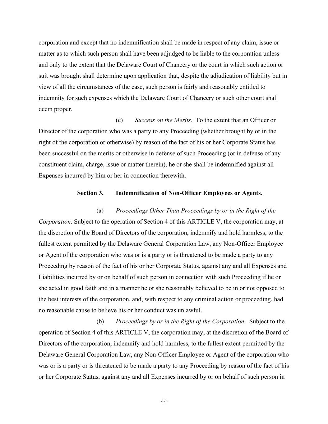 44 corporation and except that no indemnification shall be made in respect of any claim, issue or matter as to which such person shall have been adjudged to be liable to the corporation unless and only to the extent that the Delaware Court of Chancery or the court in which such action or suit was brought shall determine upon application that, despite the adjudication of liability but in view of all the circumstances of the case, such person is fairly and reasonably entitled to indemnity for such expenses which the Delaware Court of Chancery or such other court shall deem proper. (c) Success on the Merits. To the extent that an Officer or Director of the corporation who was a party to any Proceeding (whether brought by or in the right of the corporation or otherwise) by reason of the fact of his or her Corporate Status has been successful on the merits or otherwise in defense of such Proceeding (or in defense of any constituent claim, charge, issue or matter therein), he or she shall be indemnified against all Expenses incurred by him or her in connection therewith. Section 3. Indemnification of Non-Officer Employees or Agents. (a) Proceedings Other Than Proceedings by or in the Right of the Corporation. Subject to the operation of Section 4 of this ARTICLE V, the corporation may, at the discretion of the Board of Directors of the corporation, indemnify and hold harmless, to the fullest extent permitted by the Delaware General Corporation Law, any Non-Officer Employee or Agent of the corporation who was or is a party or is threatened to be made a party to any Proceeding by reason of the fact of his or her Corporate Status, against any and all Expenses and Liabilities incurred by or on behalf of such person in connection with such Proceeding if he or she acted in good faith and in a manner he or she reasonably believed to be in or not opposed to the best interests of the corporation, and, with respect to any criminal action or proceeding, had no reasonable cause to believe his or her conduct was unlawful. (b) Proceedings by or in the Right of the Corporation. Subject to the operation of Section 4 of this ARTICLE V, the corporation may, at the discretion of the Board of Directors of the corporation, indemnify and hold harmless, to the fullest extent permitted by the Delaware General Corporation Law, any Non-Officer Employee or Agent of the corporation who was or is a party or is threatened to be made a party to any Proceeding by reason of the fact of his or her Corporate Status, against any and all Expenses incurred by or on behalf of such person in