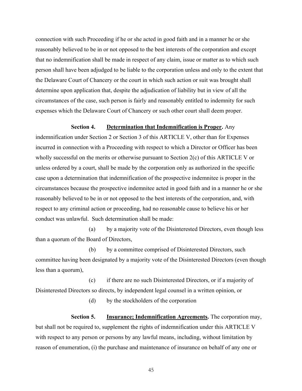 45 connection with such Proceeding if he or she acted in good faith and in a manner he or she reasonably believed to be in or not opposed to the best interests of the corporation and except that no indemnification shall be made in respect of any claim, issue or matter as to which such person shall have been adjudged to be liable to the corporation unless and only to the extent that the Delaware Court of Chancery or the court in which such action or suit was brought shall determine upon application that, despite the adjudication of liability but in view of all the circumstances of the case, such person is fairly and reasonably entitled to indemnity for such expenses which the Delaware Court of Chancery or such other court shall deem proper. Section 4. Determination that Indemnification is Proper. Any indemnification under Section 2 or Section 3 of this ARTICLE V, other than for Expenses incurred in connection with a Proceeding with respect to which a Director or Officer has been wholly successful on the merits or otherwise pursuant to Section 2(c) of this ARTICLE V or unless ordered by a court, shall be made by the corporation only as authorized in the specific case upon a determination that indemnification of the prospective indemnitee is proper in the circumstances because the prospective indemnitee acted in good faith and in a manner he or she reasonably believed to be in or not opposed to the best interests of the corporation, and, with respect to any criminal action or proceeding, had no reasonable cause to believe his or her conduct was unlawful. Such determination shall be made: (a) by a majority vote of the Disinterested Directors, even though less than a quorum of the Board of Directors, (b) by a committee comprised of Disinterested Directors, such committee having been designated by a majority vote of the Disinterested Directors (even though less than a quorum), (c) if there are no such Disinterested Directors, or if a majority of Disinterested Directors so directs, by independent legal counsel in a written opinion, or (d) by the stockholders of the corporation Section 5. Insurance; Indemnification Agreements. The corporation may, but shall not be required to, supplement the rights of indemnification under this ARTICLE V with respect to any person or persons by any lawful means, including, without limitation by reason of enumeration, (i) the purchase and maintenance of insurance on behalf of any one or