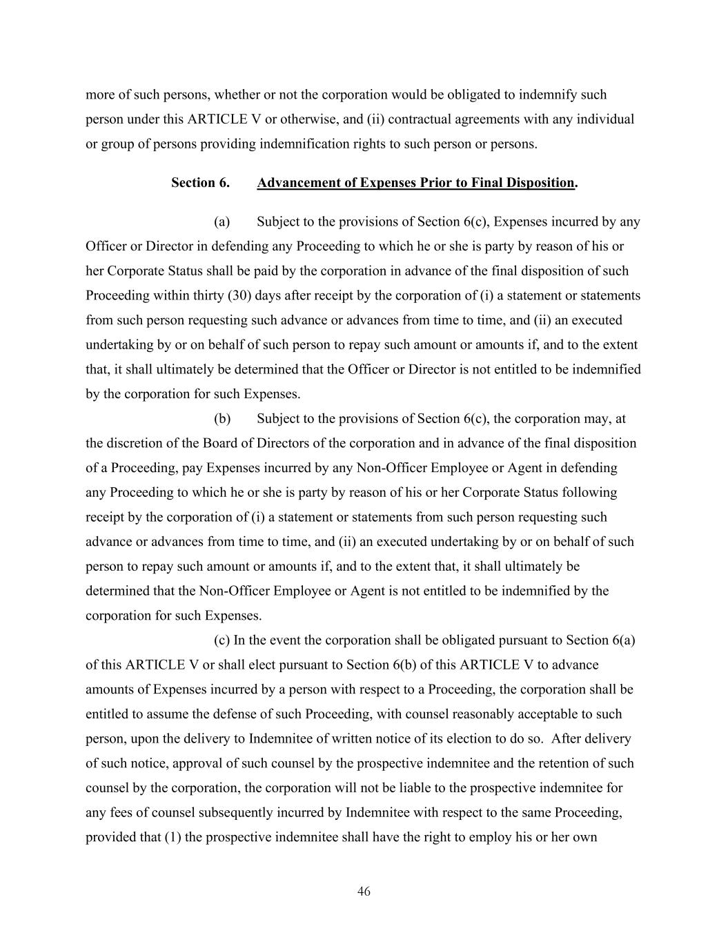 46 more of such persons, whether or not the corporation would be obligated to indemnify such person under this ARTICLE V or otherwise, and (ii) contractual agreements with any individual or group of persons providing indemnification rights to such person or persons. Section 6. Advancement of Expenses Prior to Final Disposition. (a) Subject to the provisions of Section 6(c), Expenses incurred by any Officer or Director in defending any Proceeding to which he or she is party by reason of his or her Corporate Status shall be paid by the corporation in advance of the final disposition of such Proceeding within thirty (30) days after receipt by the corporation of (i) a statement or statements from such person requesting such advance or advances from time to time, and (ii) an executed undertaking by or on behalf of such person to repay such amount or amounts if, and to the extent that, it shall ultimately be determined that the Officer or Director is not entitled to be indemnified by the corporation for such Expenses. (b) Subject to the provisions of Section 6(c), the corporation may, at the discretion of the Board of Directors of the corporation and in advance of the final disposition of a Proceeding, pay Expenses incurred by any Non-Officer Employee or Agent in defending any Proceeding to which he or she is party by reason of his or her Corporate Status following receipt by the corporation of (i) a statement or statements from such person requesting such advance or advances from time to time, and (ii) an executed undertaking by or on behalf of such person to repay such amount or amounts if, and to the extent that, it shall ultimately be determined that the Non-Officer Employee or Agent is not entitled to be indemnified by the corporation for such Expenses. (c) In the event the corporation shall be obligated pursuant to Section 6(a) of this ARTICLE V or shall elect pursuant to Section 6(b) of this ARTICLE V to advance amounts of Expenses incurred by a person with respect to a Proceeding, the corporation shall be entitled to assume the defense of such Proceeding, with counsel reasonably acceptable to such person, upon the delivery to Indemnitee of written notice of its election to do so. After delivery of such notice, approval of such counsel by the prospective indemnitee and the retention of such counsel by the corporation, the corporation will not be liable to the prospective indemnitee for any fees of counsel subsequently incurred by Indemnitee with respect to the same Proceeding, provided that (1) the prospective indemnitee shall have the right to employ his or her own