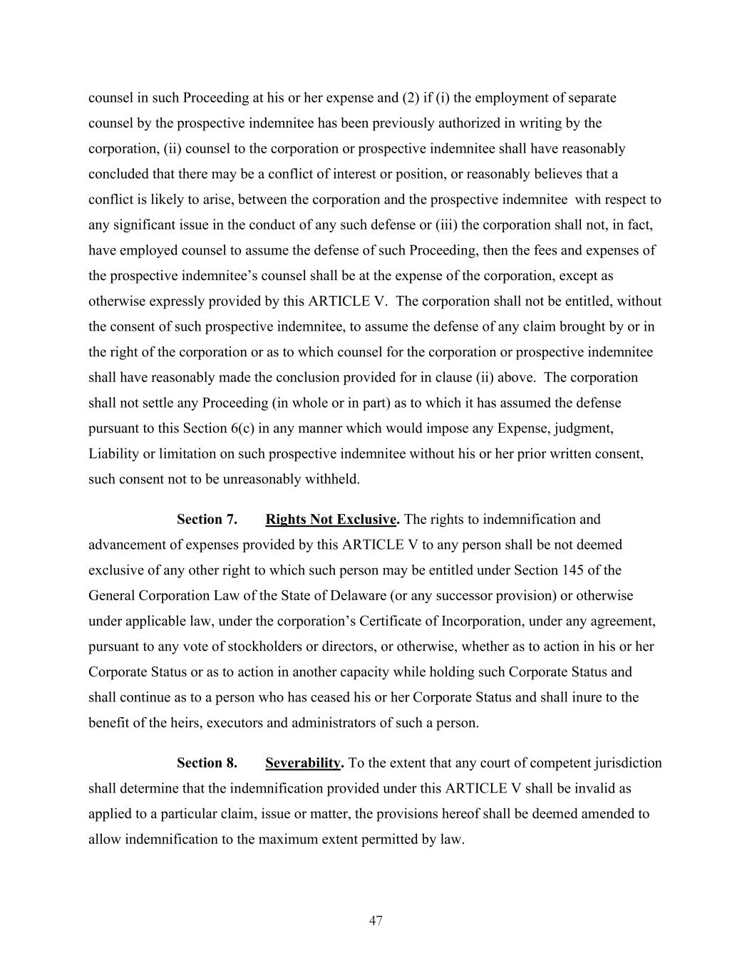 47 counsel in such Proceeding at his or her expense and (2) if (i) the employment of separate counsel by the prospective indemnitee has been previously authorized in writing by the corporation, (ii) counsel to the corporation or prospective indemnitee shall have reasonably concluded that there may be a conflict of interest or position, or reasonably believes that a conflict is likely to arise, between the corporation and the prospective indemnitee with respect to any significant issue in the conduct of any such defense or (iii) the corporation shall not, in fact, have employed counsel to assume the defense of such Proceeding, then the fees and expenses of the prospective indemnitee’s counsel shall be at the expense of the corporation, except as otherwise expressly provided by this ARTICLE V. The corporation shall not be entitled, without the consent of such prospective indemnitee, to assume the defense of any claim brought by or in the right of the corporation or as to which counsel for the corporation or prospective indemnitee shall have reasonably made the conclusion provided for in clause (ii) above. The corporation shall not settle any Proceeding (in whole or in part) as to which it has assumed the defense pursuant to this Section 6(c) in any manner which would impose any Expense, judgment, Liability or limitation on such prospective indemnitee without his or her prior written consent, such consent not to be unreasonably withheld. Section 7. Rights Not Exclusive. The rights to indemnification and advancement of expenses provided by this ARTICLE V to any person shall be not deemed exclusive of any other right to which such person may be entitled under Section 145 of the General Corporation Law of the State of Delaware (or any successor provision) or otherwise under applicable law, under the corporation’s Certificate of Incorporation, under any agreement, pursuant to any vote of stockholders or directors, or otherwise, whether as to action in his or her Corporate Status or as to action in another capacity while holding such Corporate Status and shall continue as to a person who has ceased his or her Corporate Status and shall inure to the benefit of the heirs, executors and administrators of such a person. Section 8. Severability. To the extent that any court of competent jurisdiction shall determine that the indemnification provided under this ARTICLE V shall be invalid as applied to a particular claim, issue or matter, the provisions hereof shall be deemed amended to allow indemnification to the maximum extent permitted by law.