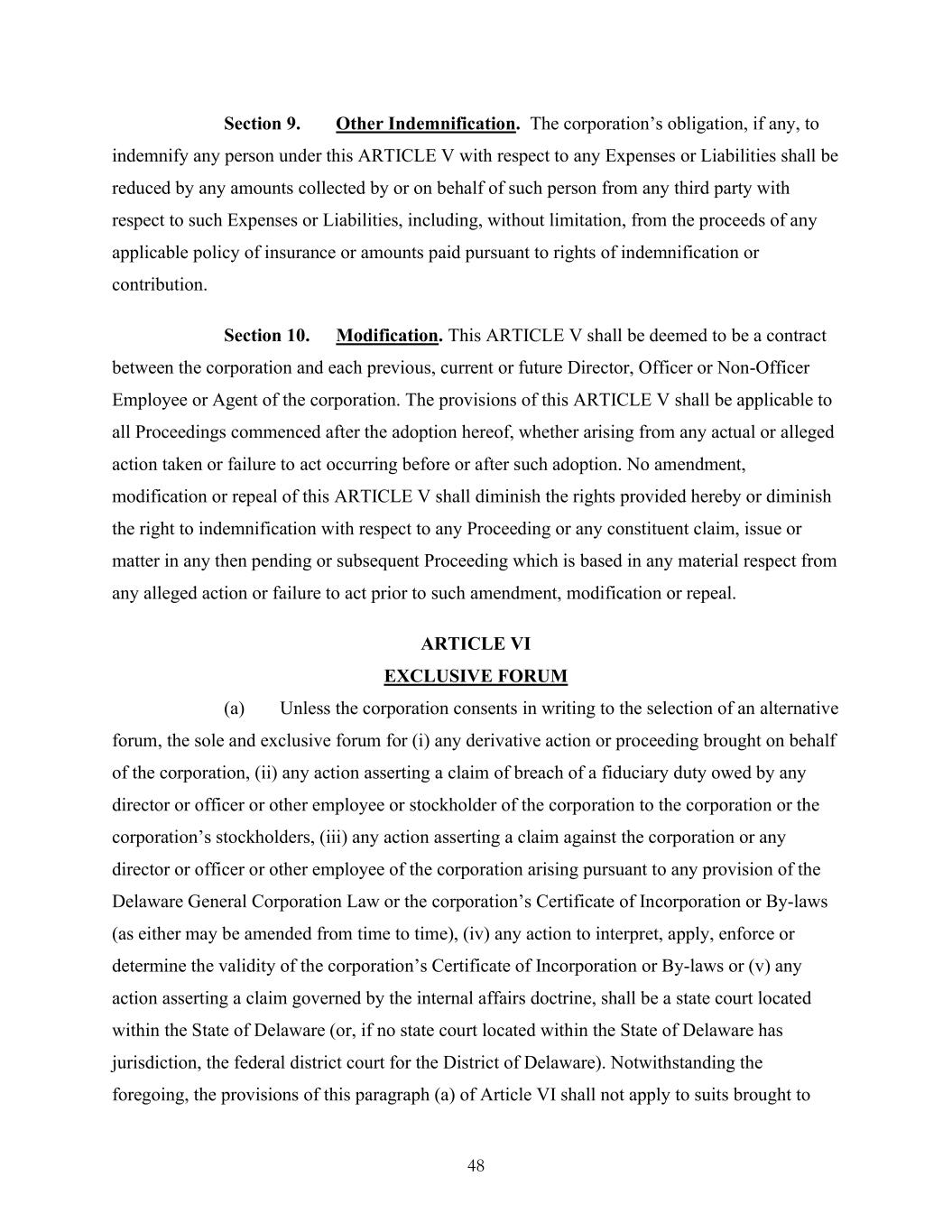 48 Section 9. Other Indemnification. The corporation’s obligation, if any, to indemnify any person under this ARTICLE V with respect to any Expenses or Liabilities shall be reduced by any amounts collected by or on behalf of such person from any third party with respect to such Expenses or Liabilities, including, without limitation, from the proceeds of any applicable policy of insurance or amounts paid pursuant to rights of indemnification or contribution. Section 10. Modification. This ARTICLE V shall be deemed to be a contract between the corporation and each previous, current or future Director, Officer or Non-Officer Employee or Agent of the corporation. The provisions of this ARTICLE V shall be applicable to all Proceedings commenced after the adoption hereof, whether arising from any actual or alleged action taken or failure to act occurring before or after such adoption. No amendment, modification or repeal of this ARTICLE V shall diminish the rights provided hereby or diminish the right to indemnification with respect to any Proceeding or any constituent claim, issue or matter in any then pending or subsequent Proceeding which is based in any material respect from any alleged action or failure to act prior to such amendment, modification or repeal. ARTICLE VI EXCLUSIVE FORUM (a) Unless the corporation consents in writing to the selection of an alternative forum, the sole and exclusive forum for (i) any derivative action or proceeding brought on behalf of the corporation, (ii) any action asserting a claim of breach of a fiduciary duty owed by any director or officer or other employee or stockholder of the corporation to the corporation or the corporation’s stockholders, (iii) any action asserting a claim against the corporation or any director or officer or other employee of the corporation arising pursuant to any provision of the Delaware General Corporation Law or the corporation’s Certificate of Incorporation or By-laws (as either may be amended from time to time), (iv) any action to interpret, apply, enforce or determine the validity of the corporation’s Certificate of Incorporation or By-laws or (v) any action asserting a claim governed by the internal affairs doctrine, shall be a state court located within the State of Delaware (or, if no state court located within the State of Delaware has jurisdiction, the federal district court for the District of Delaware). Notwithstanding the foregoing, the provisions of this paragraph (a) of Article VI shall not apply to suits brought to
