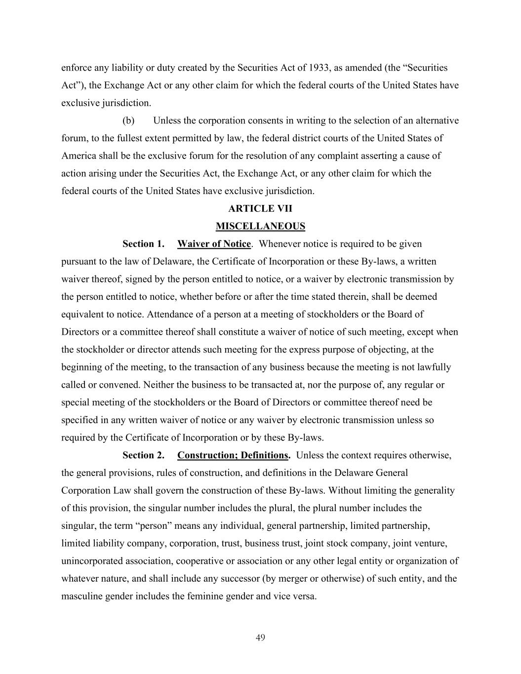 49 enforce any liability or duty created by the Securities Act of 1933, as amended (the “Securities Act”), the Exchange Act or any other claim for which the federal courts of the United States have exclusive jurisdiction. (b) Unless the corporation consents in writing to the selection of an alternative forum, to the fullest extent permitted by law, the federal district courts of the United States of America shall be the exclusive forum for the resolution of any complaint asserting a cause of action arising under the Securities Act, the Exchange Act, or any other claim for which the federal courts of the United States have exclusive jurisdiction. ARTICLE VII MISCELLANEOUS Section 1. Waiver of Notice. Whenever notice is required to be given pursuant to the law of Delaware, the Certificate of Incorporation or these By-laws, a written waiver thereof, signed by the person entitled to notice, or a waiver by electronic transmission by the person entitled to notice, whether before or after the time stated therein, shall be deemed equivalent to notice. Attendance of a person at a meeting of stockholders or the Board of Directors or a committee thereof shall constitute a waiver of notice of such meeting, except when the stockholder or director attends such meeting for the express purpose of objecting, at the beginning of the meeting, to the transaction of any business because the meeting is not lawfully called or convened. Neither the business to be transacted at, nor the purpose of, any regular or special meeting of the stockholders or the Board of Directors or committee thereof need be specified in any written waiver of notice or any waiver by electronic transmission unless so required by the Certificate of Incorporation or by these By-laws. Section 2. Construction; Definitions. Unless the context requires otherwise, the general provisions, rules of construction, and definitions in the Delaware General Corporation Law shall govern the construction of these By-laws. Without limiting the generality of this provision, the singular number includes the plural, the plural number includes the singular, the term “person” means any individual, general partnership, limited partnership, limited liability company, corporation, trust, business trust, joint stock company, joint venture, unincorporated association, cooperative or association or any other legal entity or organization of whatever nature, and shall include any successor (by merger or otherwise) of such entity, and the masculine gender includes the feminine gender and vice versa.