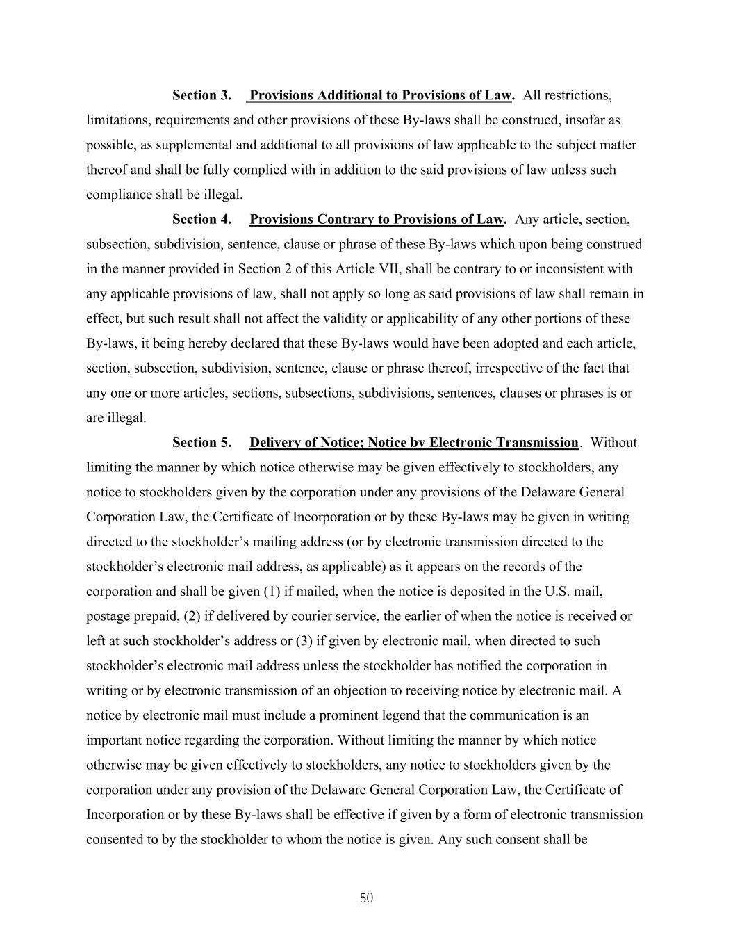 50 Section 3. Provisions Additional to Provisions of Law. All restrictions, limitations, requirements and other provisions of these By-laws shall be construed, insofar as possible, as supplemental and additional to all provisions of law applicable to the subject matter thereof and shall be fully complied with in addition to the said provisions of law unless such compliance shall be illegal. Section 4. Provisions Contrary to Provisions of Law. Any article, section, subsection, subdivision, sentence, clause or phrase of these By-laws which upon being construed in the manner provided in Section 2 of this Article VII, shall be contrary to or inconsistent with any applicable provisions of law, shall not apply so long as said provisions of law shall remain in effect, but such result shall not affect the validity or applicability of any other portions of these By-laws, it being hereby declared that these By-laws would have been adopted and each article, section, subsection, subdivision, sentence, clause or phrase thereof, irrespective of the fact that any one or more articles, sections, subsections, subdivisions, sentences, clauses or phrases is or are illegal. Section 5. Delivery of Notice; Notice by Electronic Transmission. Without limiting the manner by which notice otherwise may be given effectively to stockholders, any notice to stockholders given by the corporation under any provisions of the Delaware General Corporation Law, the Certificate of Incorporation or by these By-laws may be given in writing directed to the stockholder’s mailing address (or by electronic transmission directed to the stockholder’s electronic mail address, as applicable) as it appears on the records of the corporation and shall be given (1) if mailed, when the notice is deposited in the U.S. mail, postage prepaid, (2) if delivered by courier service, the earlier of when the notice is received or left at such stockholder’s address or (3) if given by electronic mail, when directed to such stockholder’s electronic mail address unless the stockholder has notified the corporation in writing or by electronic transmission of an objection to receiving notice by electronic mail. A notice by electronic mail must include a prominent legend that the communication is an important notice regarding the corporation. Without limiting the manner by which notice otherwise may be given effectively to stockholders, any notice to stockholders given by the corporation under any provision of the Delaware General Corporation Law, the Certificate of Incorporation or by these By-laws shall be effective if given by a form of electronic transmission consented to by the stockholder to whom the notice is given. Any such consent shall be