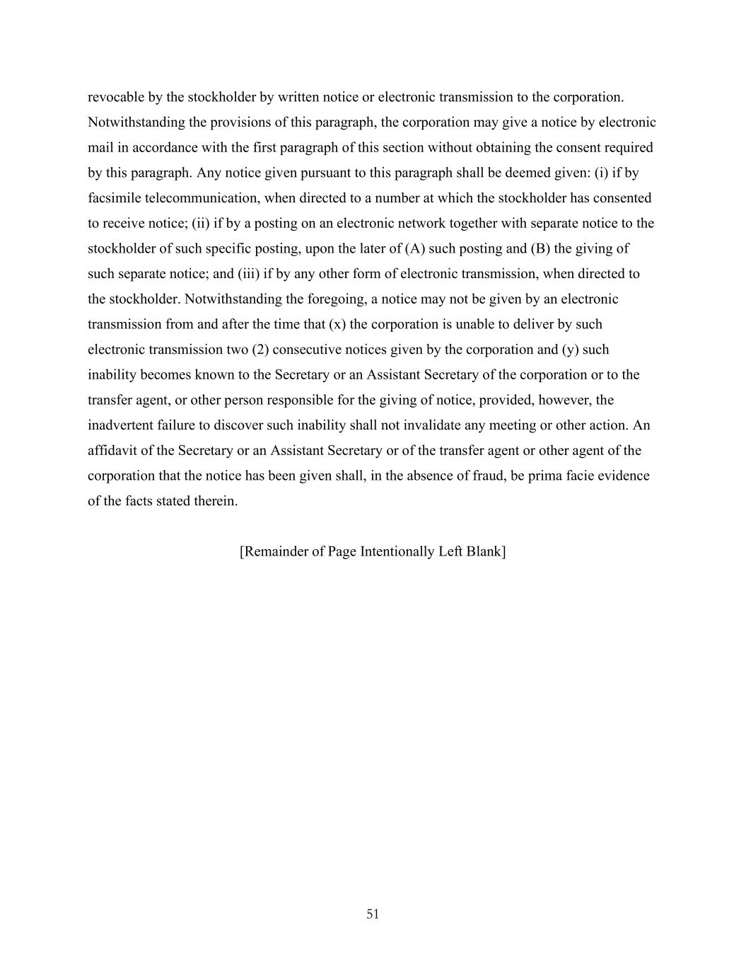 51 revocable by the stockholder by written notice or electronic transmission to the corporation. Notwithstanding the provisions of this paragraph, the corporation may give a notice by electronic mail in accordance with the first paragraph of this section without obtaining the consent required by this paragraph. Any notice given pursuant to this paragraph shall be deemed given: (i) if by facsimile telecommunication, when directed to a number at which the stockholder has consented to receive notice; (ii) if by a posting on an electronic network together with separate notice to the stockholder of such specific posting, upon the later of (A) such posting and (B) the giving of such separate notice; and (iii) if by any other form of electronic transmission, when directed to the stockholder. Notwithstanding the foregoing, a notice may not be given by an electronic transmission from and after the time that (x) the corporation is unable to deliver by such electronic transmission two (2) consecutive notices given by the corporation and (y) such inability becomes known to the Secretary or an Assistant Secretary of the corporation or to the transfer agent, or other person responsible for the giving of notice, provided, however, the inadvertent failure to discover such inability shall not invalidate any meeting or other action. An affidavit of the Secretary or an Assistant Secretary or of the transfer agent or other agent of the corporation that the notice has been given shall, in the absence of fraud, be prima facie evidence of the facts stated therein. [Remainder of Page Intentionally Left Blank]