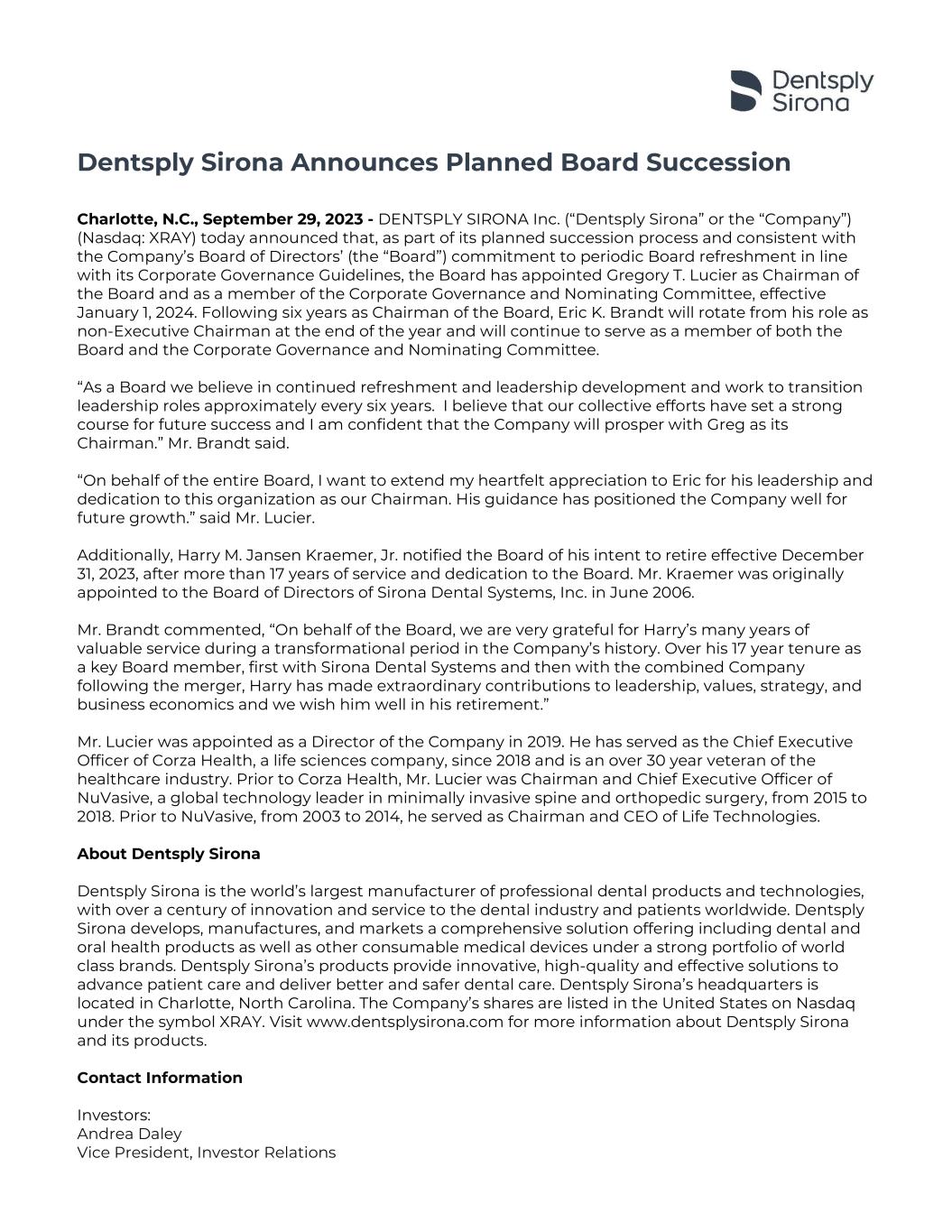 Dentsply Sirona Announces Planned Board Succession Charlotte, N.C., September 29, 2023 - DENTSPLY SIRONA Inc. (“Dentsply Sirona” or the “Company”) (Nasdaq: XRAY) today announced that, as part of its planned succession process and consistent with the Company’s Board of Directors’ (the “Board”) commitment to periodic Board refreshment in line with its Corporate Governance Guidelines, the Board has appointed Gregory T. Lucier as Chairman of the Board and as a member of the Corporate Governance and Nominating Committee, effective January 1, 2024. Following six years as Chairman of the Board, Eric K. Brandt will rotate from his role as non-Executive Chairman at the end of the year and will continue to serve as a member of both the Board and the Corporate Governance and Nominating Committee. “As a Board we believe in continued refreshment and leadership development and work to transition leadership roles approximately every six years. I believe that our collective efforts have set a strong course for future success and I am confident that the Company will prosper with Greg as its Chairman.” Mr. Brandt said. “On behalf of the entire Board, I want to extend my heartfelt appreciation to Eric for his leadership and dedication to this organization as our Chairman. His guidance has positioned the Company well for future growth.” said Mr. Lucier. Additionally, Harry M. Jansen Kraemer, Jr. notified the Board of his intent to retire effective December 31, 2023, after more than 17 years of service and dedication to the Board. Mr. Kraemer was originally appointed to the Board of Directors of Sirona Dental Systems, Inc. in June 2006. Mr. Brandt commented, “On behalf of the Board, we are very grateful for Harry’s many years of valuable service during a transformational period in the Company’s history. Over his 17 year tenure as a key Board member, first with Sirona Dental Systems and then with the combined Company following the merger, Harry has made extraordinary contributions to leadership, values, strategy, and business economics and we wish him well in his retirement.” Mr. Lucier was appointed as a Director of the Company in 2019. He has served as the Chief Executive Officer of Corza Health, a life sciences company, since 2018 and is an over 30 year veteran of the healthcare industry. Prior to Corza Health, Mr. Lucier was Chairman and Chief Executive Officer of NuVasive, a global technology leader in minimally invasive spine and orthopedic surgery, from 2015 to 2018. Prior to NuVasive, from 2003 to 2014, he served as Chairman and CEO of Life Technologies. About Dentsply Sirona Dentsply Sirona is the world’s largest manufacturer of professional dental products and technologies, with over a century of innovation and service to the dental industry and patients worldwide. Dentsply Sirona develops, manufactures, and markets a comprehensive solution offering including dental and oral health products as well as other consumable medical devices under a strong portfolio of world class brands. Dentsply Sirona’s products provide innovative, high-quality and effective solutions to advance patient care and deliver better and safer dental care. Dentsply Sirona’s headquarters is located in Charlotte, North Carolina. The Company’s shares are listed in the United States on Nasdaq under the symbol XRAY. Visit www.dentsplysirona.com for more information about Dentsply Sirona and its products. Contact Information Investors: Andrea Daley Vice President, Investor Relations