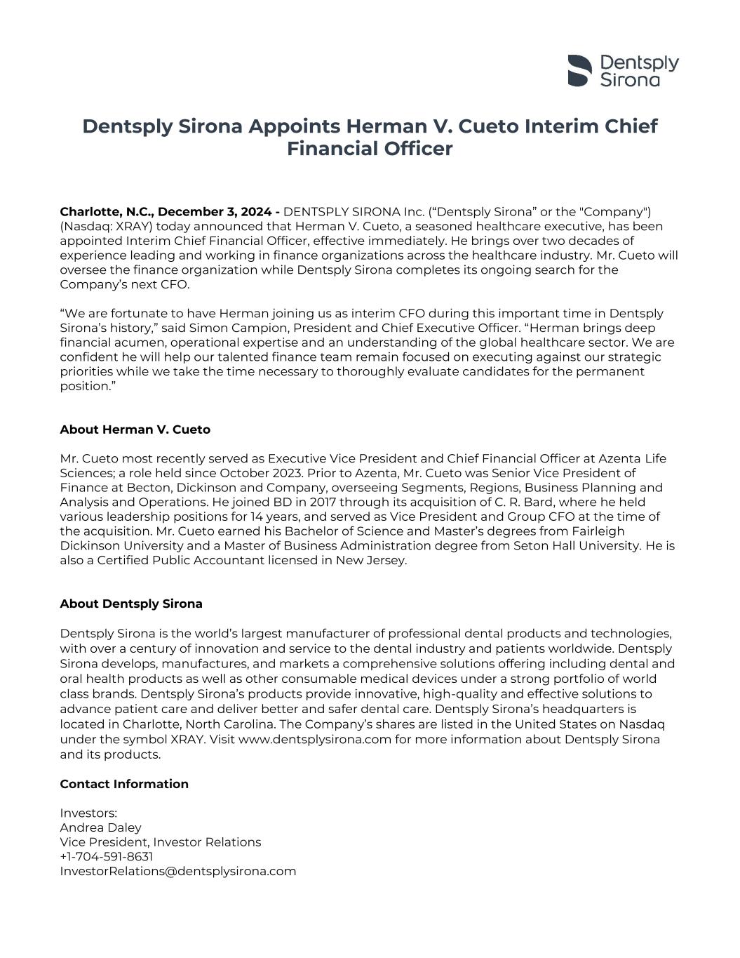 Dentsply Sirona Appoints Herman V. Cueto Interim Chief Financial Officer Charlotte, N.C., December 3, 2024 - DENTSPLY SIRONA Inc. (“Dentsply Sirona” or the "Company") (Nasdaq: XRAY) today announced that Herman V. Cueto, a seasoned healthcare executive, has been appointed Interim Chief Financial Officer, effective immediately. He brings over two decades of experience leading and working in finance organizations across the healthcare industry. Mr. Cueto will oversee the finance organization while Dentsply Sirona completes its ongoing search for the Company’s next CFO. “We are fortunate to have Herman joining us as interim CFO during this important time in Dentsply Sirona’s history,” said Simon Campion, President and Chief Executive Officer. “Herman brings deep financial acumen, operational expertise and an understanding of the global healthcare sector. We are confident he will help our talented finance team remain focused on executing against our strategic priorities while we take the time necessary to thoroughly evaluate candidates for the permanent position.” About Herman V. Cueto Mr. Cueto most recently served as Executive Vice President and Chief Financial Officer at Azenta Life Sciences; a role held since October 2023. Prior to Azenta, Mr. Cueto was Senior Vice President of Finance at Becton, Dickinson and Company, overseeing Segments, Regions, Business Planning and Analysis and Operations. He joined BD in 2017 through its acquisition of C. R. Bard, where he held various leadership positions for 14 years, and served as Vice President and Group CFO at the time of the acquisition. Mr. Cueto earned his Bachelor of Science and Master’s degrees from Fairleigh Dickinson University and a Master of Business Administration degree from Seton Hall University. He is also a Certified Public Accountant licensed in New Jersey. About Dentsply Sirona Dentsply Sirona is the world’s largest manufacturer of professional dental products and technologies, with over a century of innovation and service to the dental industry and patients worldwide. Dentsply Sirona develops, manufactures, and markets a comprehensive solutions offering including dental and oral health products as well as other consumable medical devices under a strong portfolio of world class brands. Dentsply Sirona’s products provide innovative, high-quality and effective solutions to advance patient care and deliver better and safer dental care. Dentsply Sirona’s headquarters is located in Charlotte, North Carolina. The Company’s shares are listed in the United States on Nasdaq under the symbol XRAY. Visit www.dentsplysirona.com for more information about Dentsply Sirona and its products. Contact Information Investors: Andrea Daley Vice President, Investor Relations +1-704-591-8631 InvestorRelations@dentsplysirona.com