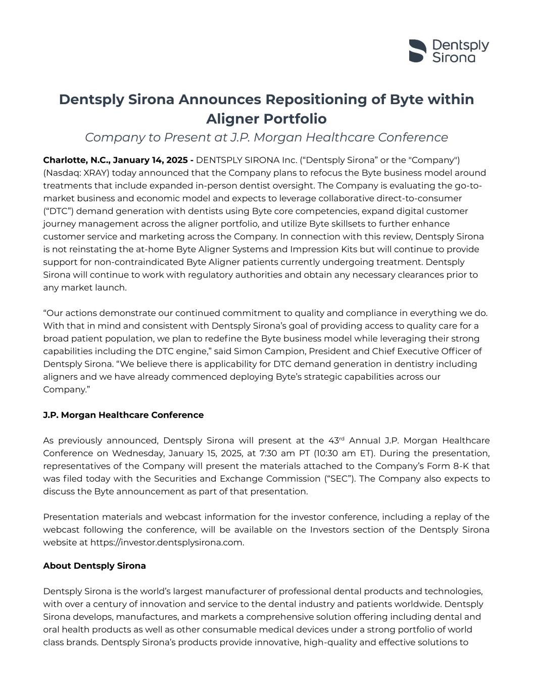 Dentsply Sirona Announces Repositioning of Byte within Aligner Portfolio Company to Present at J.P. Morgan Healthcare Conference Charlotte, N.C., January 14, 2025 - DENTSPLY SIRONA Inc. (“Dentsply Sirona” or the "Company") (Nasdaq: XRAY) today announced that the Company plans to refocus the Byte business model around treatments that include expanded in-person dentist oversight. The Company is evaluating the go-to- market business and economic model and expects to leverage collaborative direct-to-consumer (“DTC”) demand generation with dentists using Byte core competencies, expand digital customer journey management across the aligner portfolio, and utilize Byte skillsets to further enhance customer service and marketing across the Company. In connection with this review, Dentsply Sirona is not reinstating the at-home Byte Aligner Systems and Impression Kits but will continue to provide support for non-contraindicated Byte Aligner patients currently undergoing treatment. Dentsply Sirona will continue to work with regulatory authorities and obtain any necessary clearances prior to any market launch. “Our actions demonstrate our continued commitment to quality and compliance in everything we do. With that in mind and consistent with Dentsply Sirona’s goal of providing access to quality care for a broad patient population, we plan to redefine the Byte business model while leveraging their strong capabilities including the DTC engine,” said Simon Campion, President and Chief Executive Officer of Dentsply Sirona. “We believe there is applicability for DTC demand generation in dentistry including aligners and we have already commenced deploying Byte’s strategic capabilities across our Company.” J.P. Morgan Healthcare Conference As previously announced, Dentsply Sirona will present at the 43rd Annual J.P. Morgan Healthcare Conference on Wednesday, January 15, 2025, at 7:30 am PT (10:30 am ET). During the presentation, representatives of the Company will present the materials attached to the Company’s Form 8-K that was filed today with the Securities and Exchange Commission (“SEC”). The Company also expects to discuss the Byte announcement as part of that presentation. Presentation materials and webcast information for the investor conference, including a replay of the webcast following the conference, will be available on the Investors section of the Dentsply Sirona website at https://investor.dentsplysirona.com. About Dentsply Sirona Dentsply Sirona is the world’s largest manufacturer of professional dental products and technologies, with over a century of innovation and service to the dental industry and patients worldwide. Dentsply Sirona develops, manufactures, and markets a comprehensive solution offering including dental and oral health products as well as other consumable medical devices under a strong portfolio of world class brands. Dentsply Sirona’s products provide innovative, high-quality and effective solutions to