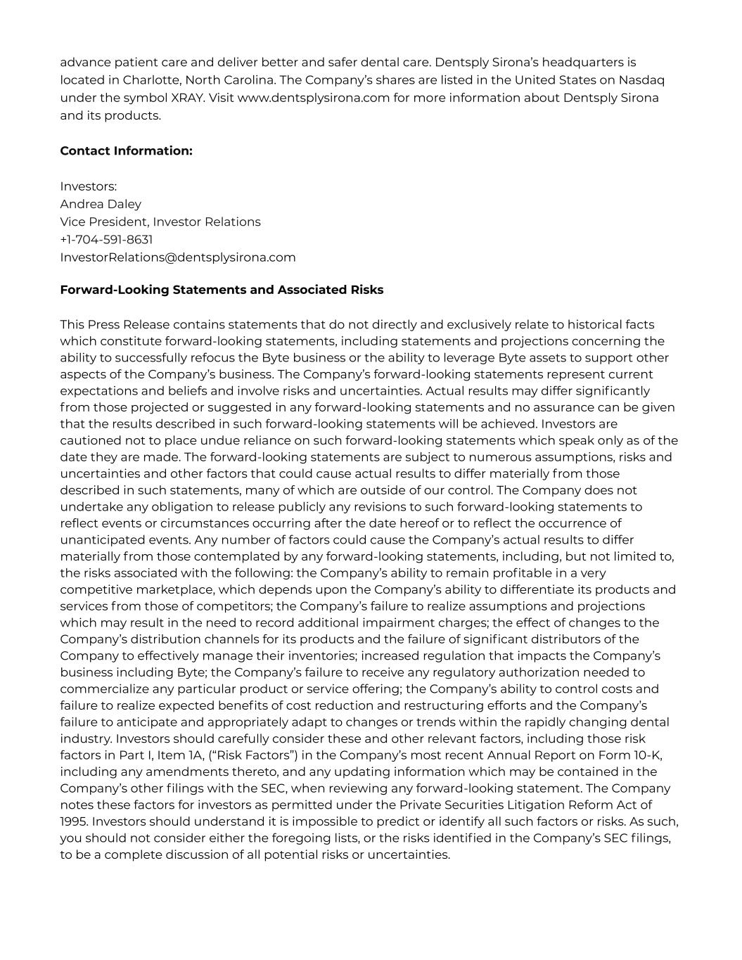 advance patient care and deliver better and safer dental care. Dentsply Sirona’s headquarters is located in Charlotte, North Carolina. The Company’s shares are listed in the United States on Nasdaq under the symbol XRAY. Visit www.dentsplysirona.com for more information about Dentsply Sirona and its products. Contact Information: Investors: Andrea Daley Vice President, Investor Relations +1-704-591-8631 InvestorRelations@dentsplysirona.com Forward-Looking Statements and Associated Risks This Press Release contains statements that do not directly and exclusively relate to historical facts which constitute forward-looking statements, including statements and projections concerning the ability to successfully refocus the Byte business or the ability to leverage Byte assets to support other aspects of the Company’s business. The Company’s forward-looking statements represent current expectations and beliefs and involve risks and uncertainties. Actual results may differ significantly from those projected or suggested in any forward-looking statements and no assurance can be given that the results described in such forward-looking statements will be achieved. Investors are cautioned not to place undue reliance on such forward-looking statements which speak only as of the date they are made. The forward-looking statements are subject to numerous assumptions, risks and uncertainties and other factors that could cause actual results to differ materially from those described in such statements, many of which are outside of our control. The Company does not undertake any obligation to release publicly any revisions to such forward-looking statements to reflect events or circumstances occurring after the date hereof or to reflect the occurrence of unanticipated events. Any number of factors could cause the Company’s actual results to differ materially from those contemplated by any forward-looking statements, including, but not limited to, the risks associated with the following: the Company’s ability to remain profitable in a very competitive marketplace, which depends upon the Company’s ability to differentiate its products and services from those of competitors; the Company’s failure to realize assumptions and projections which may result in the need to record additional impairment charges; the effect of changes to the Company’s distribution channels for its products and the failure of significant distributors of the Company to effectively manage their inventories; increased regulation that impacts the Company’s business including Byte; the Company’s failure to receive any regulatory authorization needed to commercialize any particular product or service offering; the Company’s ability to control costs and failure to realize expected benefits of cost reduction and restructuring efforts and the Company’s failure to anticipate and appropriately adapt to changes or trends within the rapidly changing dental industry. Investors should carefully consider these and other relevant factors, including those risk factors in Part I, Item 1A, (“Risk Factors”) in the Company’s most recent Annual Report on Form 10-K, including any amendments thereto, and any updating information which may be contained in the Company’s other filings with the SEC, when reviewing any forward-looking statement. The Company notes these factors for investors as permitted under the Private Securities Litigation Reform Act of 1995. Investors should understand it is impossible to predict or identify all such factors or risks. As such, you should not consider either the foregoing lists, or the risks identified in the Company’s SEC filings, to be a complete discussion of all potential risks or uncertainties.