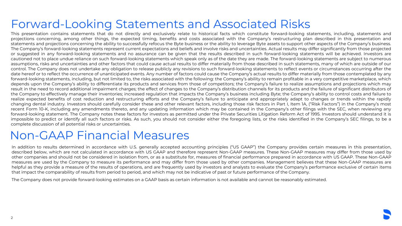Forward-Looking Statements and Associated Risks This presentation contains statements that do not directly and exclusively relate to historical facts which constitute forward-looking statements, including, statements and projections concerning, among other things, the expected timing, benefits and costs associated with the Company’s restructuring plan described in this presentation and statements and projections concerning the ability to successfully refocus the Byte business or the ability to leverage Byte assets to support other aspects of the Company’s business. The Company’s forward-looking statements represent current expectations and beliefs and involve risks and uncertainties. Actual results may differ significantly from those projected or suggested in any forward-looking statements and no assurance can be given that the results described in such forward-looking statements will be achieved. Investors are cautioned not to place undue reliance on such forward-looking statements which speak only as of the date they are made. The forward-looking statements are subject to numerous assumptions, risks and uncertainties and other factors that could cause actual results to differ materially from those described in such statements, many of which are outside of our control. The Company does not undertake any obligation to release publicly any revisions to such forward-looking statements to reflect events or circumstances occurring after the date hereof or to reflect the occurrence of unanticipated events. Any number of factors could cause the Company’s actual results to differ materially from those contemplated by any forward-looking statements, including, but not limited to, the risks associated with the following: the Company’s ability to remain profitable in a very competitive marketplace, which depends upon the Company’s ability to differentiate its products and services from those of competitors; the Company’s failure to realize assumptions and projections which may result in the need to record additional impairment charges; the effect of changes to the Company’s distribution channels for its products and the failure of significant distributors of the Company to effectively manage their inventories; increased regulation that impacts the Company’s business including Byte; the Company’s ability to control costs and failure to realize expected benefits of cost reduction and restructuring efforts and the Company’s failure to anticipate and appropriately adapt to changes or trends within the rapidly changing dental industry. Investors should carefully consider these and other relevant factors, including those risk factors in Part I, Item 1A, (“Risk Factors”) in the Company’s most recent Form 10-K, including any amendments thereto, and any updating information which may be contained in the Company’s other filings with the SEC, when reviewing any forward-looking statement. The Company notes these factors for investors as permitted under the Private Securities Litigation Reform Act of 1995. Investors should understand it is impossible to predict or identify all such factors or risks. As such, you should not consider either the foregoing lists, or the risks identified in the Company’s SEC filings, to be a complete discussion of all potential risks or uncertainties. 2 Non-GAAP Financial Measures In addition to results determined in accordance with U.S. generally accepted accounting principles (“US GAAP”) the Company provides certain measures in this presentation, described below, which are not calculated in accordance with US GAAP and therefore represent Non-GAAP measures. These Non-GAAP measures may differ from those used by other companies and should not be considered in isolation from, or as a substitute for, measures of financial performance prepared in accordance with US GAAP. These Non-GAAP measures are used by the Company to measure its performance and may differ from those used by other companies. Management believes that these Non-GAAP measures are helpful as they provide a measure of the results of operations, and are frequently used by investors and analysts to evaluate the Company’s performance exclusive of certain items that impact the comparability of results from period to period, and which may not be indicative of past or future performance of the Company. The Company does not provide forward-looking estimates on a GAAP basis as certain information is not available and cannot be reasonably estimated.
