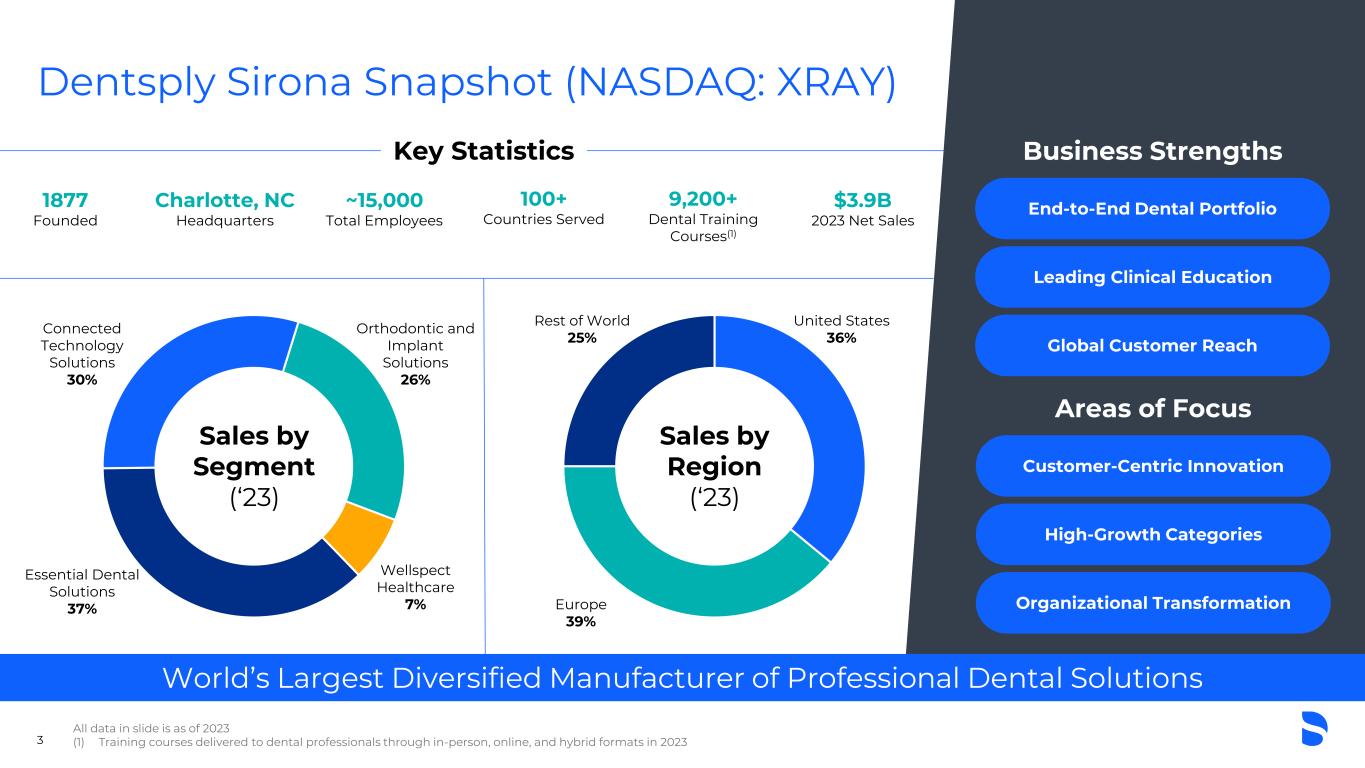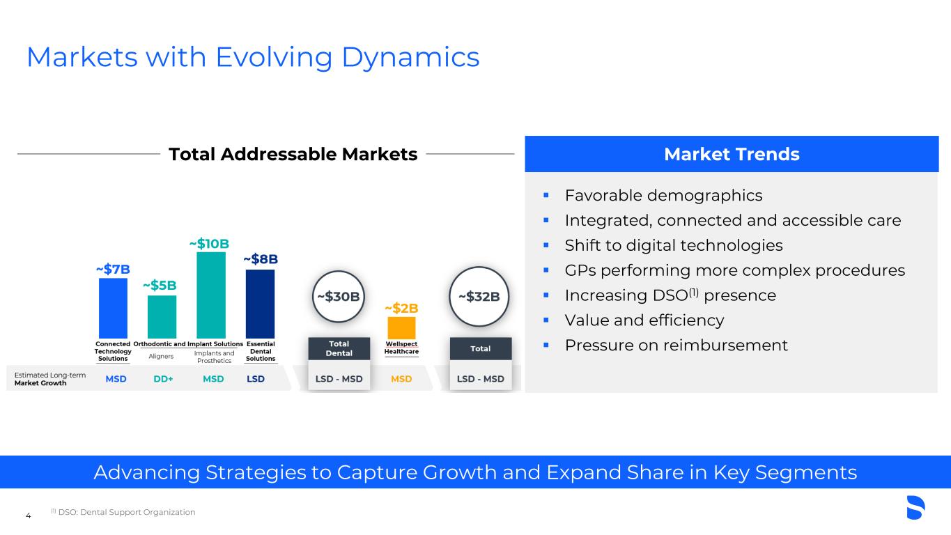 Dentsply Sirona Snapshot (NASDAQ: XRAY) World’s Largest Diversified Manufacturer of Professional Dental Solutions Essential Dental Solutions 37% Connected Technology Solutions 30% Wellspect Healthcare 7% Orthodontic and Implant Solutions 26% United States 36% Europe 39% Rest of World 25% Key Statistics 1877 Founded Charlotte, NC Headquarters ~15,000 Total Employees 100+ Countries Served $3.9B 2023 Net Sales Business Strengths End-to-End Dental Portfolio Leading Clinical Education Global Customer Reach All data in slide is as of 2023 (1) Training courses delivered to dental professionals through in-person, online, and hybrid formats in 20233 Sales by Segment (‘23) Sales by Region (‘23) 9,200+ Dental Training Courses(1) Areas of Focus Customer-Centric Innovation High-Growth Categories Organizational Transformation