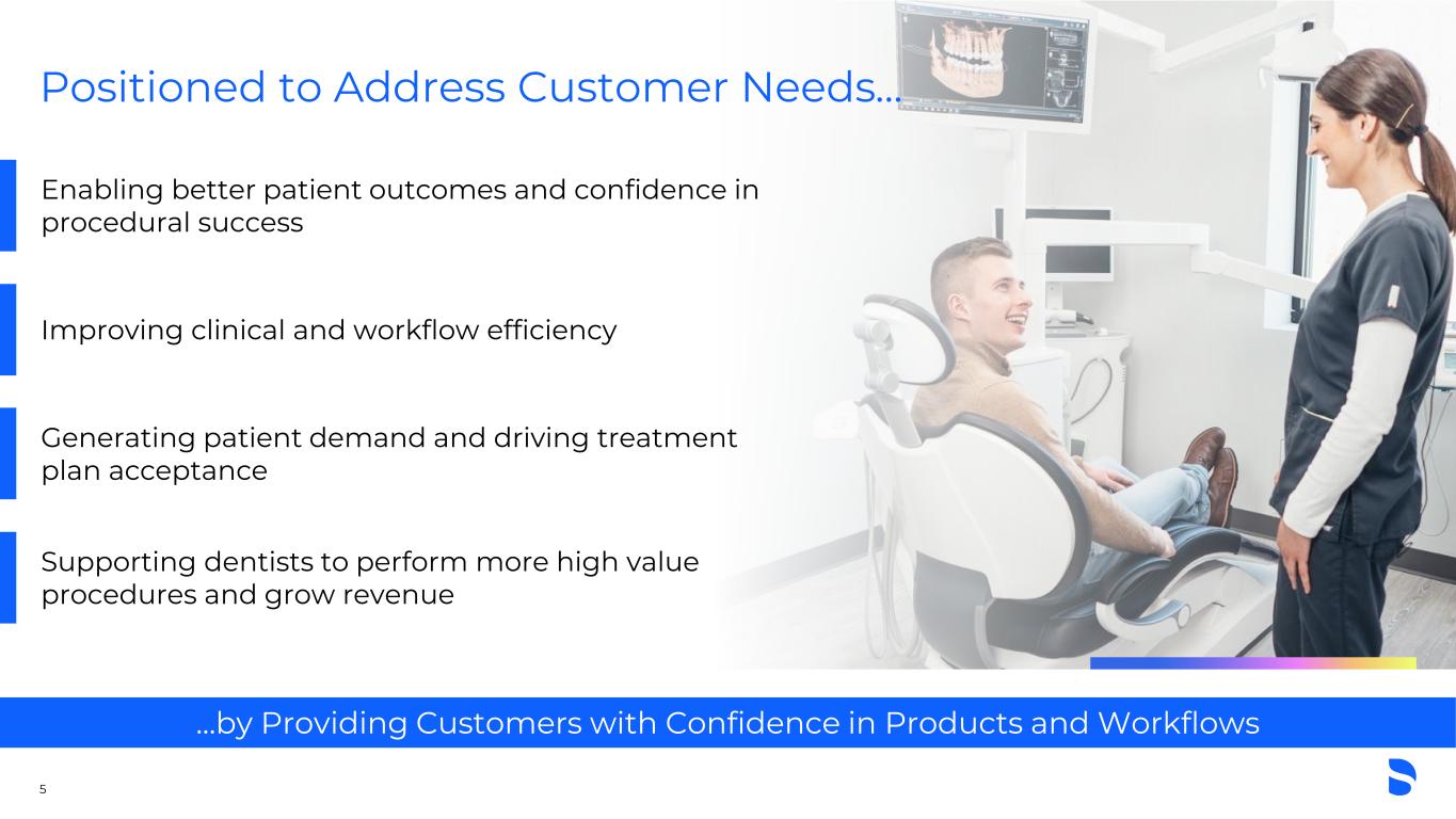 Markets with Evolving Dynamics 4 ▪ Favorable demographics ▪ Integrated, connected and accessible care ▪ Shift to digital technologies ▪ GPs performing more complex procedures ▪ Increasing DSO(1) presence ▪ Value and efficiency ▪ Pressure on reimbursement Market Trends Advancing Strategies to Capture Growth and Expand Share in Key Segments Total Addressable Markets (1) DSO: Dental Support Organization