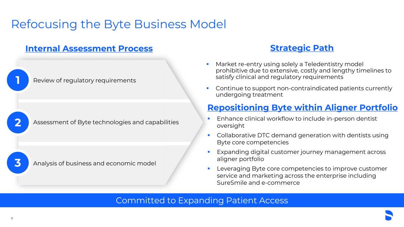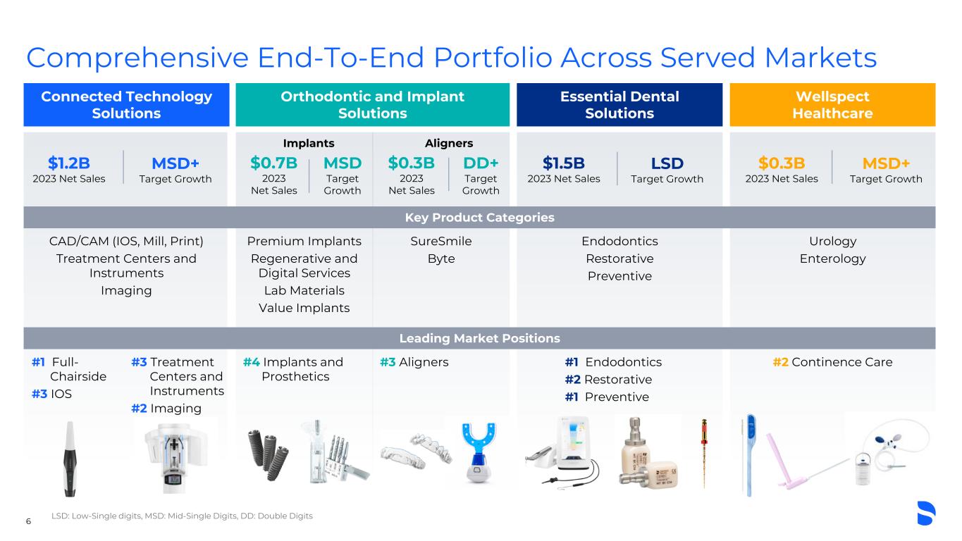 Wellspect Healthcare $0.3B 2023 Net Sales Urology Enterology MSD+ Target Growth​ #2 Continence Care Essential Dental Solutions $1.5B 2023 Net Sales Endodontics Restorative Preventive LSD Target Growth​ #1 Endodontics #2 Restorative #1 Preventive Orthodontic and Implant Solutions $0.7B 2023 Net Sales Implants $0.3B 2023 Net Sales Aligners Premium Implants Regenerative and Digital Services Lab Materials Value Implants SureSmile Byte MSD Target Growth DD+ Target Growth #4 Implants and Prosthetics #3 Aligners Connected Technology Solutions $1.2B 2023 Net Sales CAD/CAM (IOS, Mill, Print) Treatment Centers and Instruments Imaging MSD+ Target Growth​ #1 Full- Chairside #3 IOS #3 Treatment Centers and Instruments #2 Imaging Comprehensive End-To-End Portfolio Across Served Markets 6 Key Product Categories Leading Market Positions LSD: Low-Single digits, MSD: Mid-Single Digits, DD: Double Digits