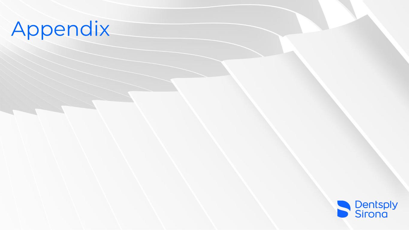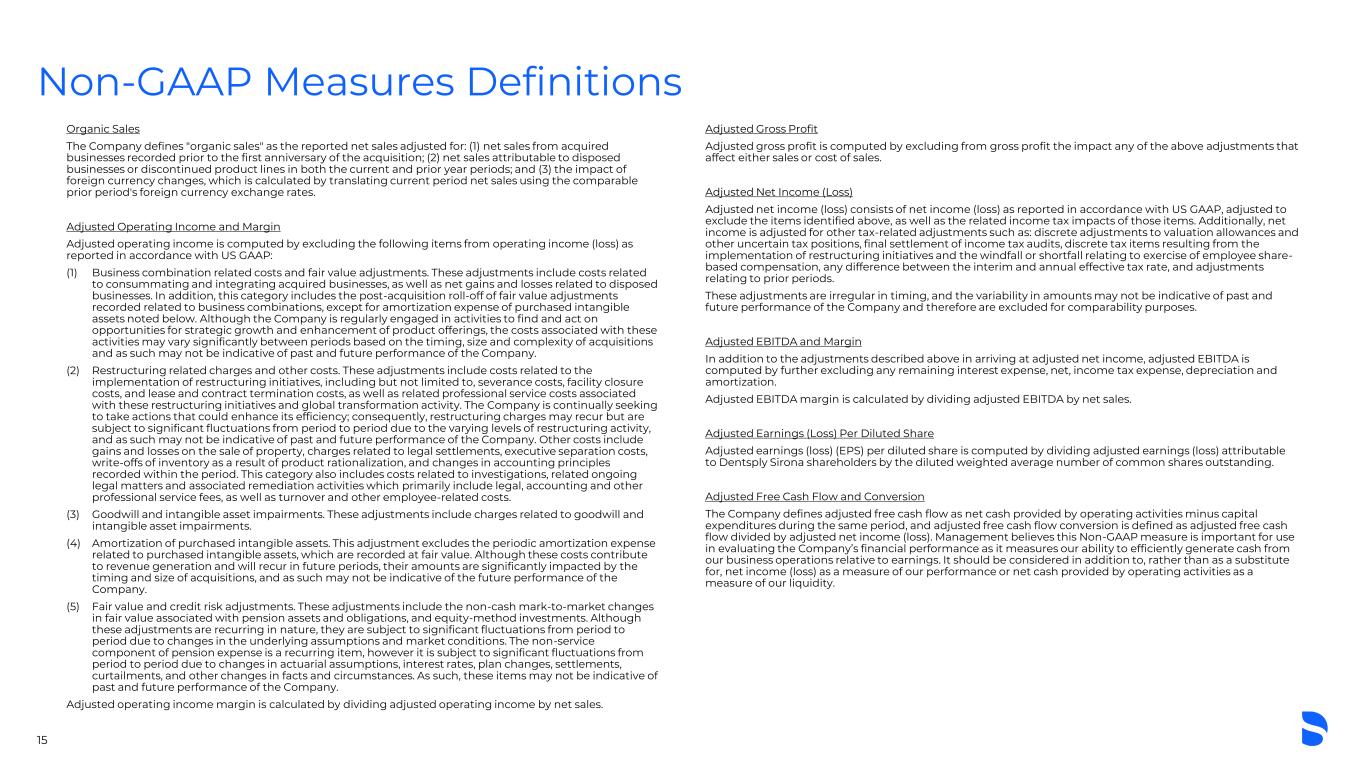 Non-GAAP Measures Definitions 15 Organic Sales The Company defines "organic sales" as the reported net sales adjusted for: (1) net sales from acquired businesses recorded prior to the first anniversary of the acquisition; (2) net sales attributable to disposed businesses or discontinued product lines in both the current and prior year periods; and (3) the impact of foreign currency changes, which is calculated by translating current period net sales using the comparable prior period's foreign currency exchange rates. Adjusted Operating Income and Margin Adjusted operating income is computed by excluding the following items from operating income (loss) as reported in accordance with US GAAP: (1) Business combination related costs and fair value adjustments. These adjustments include costs related to consummating and integrating acquired businesses, as well as net gains and losses related to disposed businesses. In addition, this category includes the post-acquisition roll-off of fair value adjustments recorded related to business combinations, except for amortization expense of purchased intangible assets noted below. Although the Company is regularly engaged in activities to find and act on opportunities for strategic growth and enhancement of product offerings, the costs associated with these activities may vary significantly between periods based on the timing, size and complexity of acquisitions and as such may not be indicative of past and future performance of the Company. (2) Restructuring related charges and other costs. These adjustments include costs related to the implementation of restructuring initiatives, including but not limited to, severance costs, facility closure costs, and lease and contract termination costs, as well as related professional service costs associated with these restructuring initiatives and global transformation activity. The Company is continually seeking to take actions that could enhance its efficiency; consequently, restructuring charges may recur but are subject to significant fluctuations from period to period due to the varying levels of restructuring activity, and as such may not be indicative of past and future performance of the Company. Other costs include gains and losses on the sale of property, charges related to legal settlements, executive separation costs, write-offs of inventory as a result of product rationalization, and changes in accounting principles recorded within the period. This category also includes costs related to investigations, related ongoing legal matters and associated remediation activities which primarily include legal, accounting and other professional service fees, as well as turnover and other employee-related costs. (3) Goodwill and intangible asset impairments. These adjustments include charges related to goodwill and intangible asset impairments. (4) Amortization of purchased intangible assets. This adjustment excludes the periodic amortization expense related to purchased intangible assets, which are recorded at fair value. Although these costs contribute to revenue generation and will recur in future periods, their amounts are significantly impacted by the timing and size of acquisitions, and as such may not be indicative of the future performance of the Company. (5) Fair value and credit risk adjustments. These adjustments include the non-cash mark-to-market changes in fair value associated with pension assets and obligations, and equity-method investments. Although these adjustments are recurring in nature, they are subject to significant fluctuations from period to period due to changes in the underlying assumptions and market conditions. The non-service component of pension expense is a recurring item, however it is subject to significant fluctuations from period to period due to changes in actuarial assumptions, interest rates, plan changes, settlements, curtailments, and other changes in facts and circumstances. As such, these items may not be indicative of past and future performance of the Company. Adjusted operating income margin is calculated by dividing adjusted operating income by net sales. Adjusted Gross Profit Adjusted gross profit is computed by excluding from gross profit the impact any of the above adjustments that affect either sales or cost of sales. Adjusted Net Income (Loss) Adjusted net income (loss) consists of net income (loss) as reported in accordance with US GAAP, adjusted to exclude the items identified above, as well as the related income tax impacts of those items. Additionally, net income is adjusted for other tax-related adjustments such as: discrete adjustments to valuation allowances and other uncertain tax positions, final settlement of income tax audits, discrete tax items resulting from the implementation of restructuring initiatives and the windfall or shortfall relating to exercise of employee share- based compensation, any difference between the interim and annual effective tax rate, and adjustments relating to prior periods. These adjustments are irregular in timing, and the variability in amounts may not be indicative of past and future performance of the Company and therefore are excluded for comparability purposes. Adjusted EBITDA and Margin In addition to the adjustments described above in arriving at adjusted net income, adjusted EBITDA is computed by further excluding any remaining interest expense, net, income tax expense, depreciation and amortization. Adjusted EBITDA margin is calculated by dividing adjusted EBITDA by net sales. Adjusted Earnings (Loss) Per Diluted Share Adjusted earnings (loss) (EPS) per diluted share is computed by dividing adjusted earnings (loss) attributable to Dentsply Sirona shareholders by the diluted weighted average number of common shares outstanding. Adjusted Free Cash Flow and Conversion The Company defines adjusted free cash flow as net cash provided by operating activities minus capital expenditures during the same period, and 