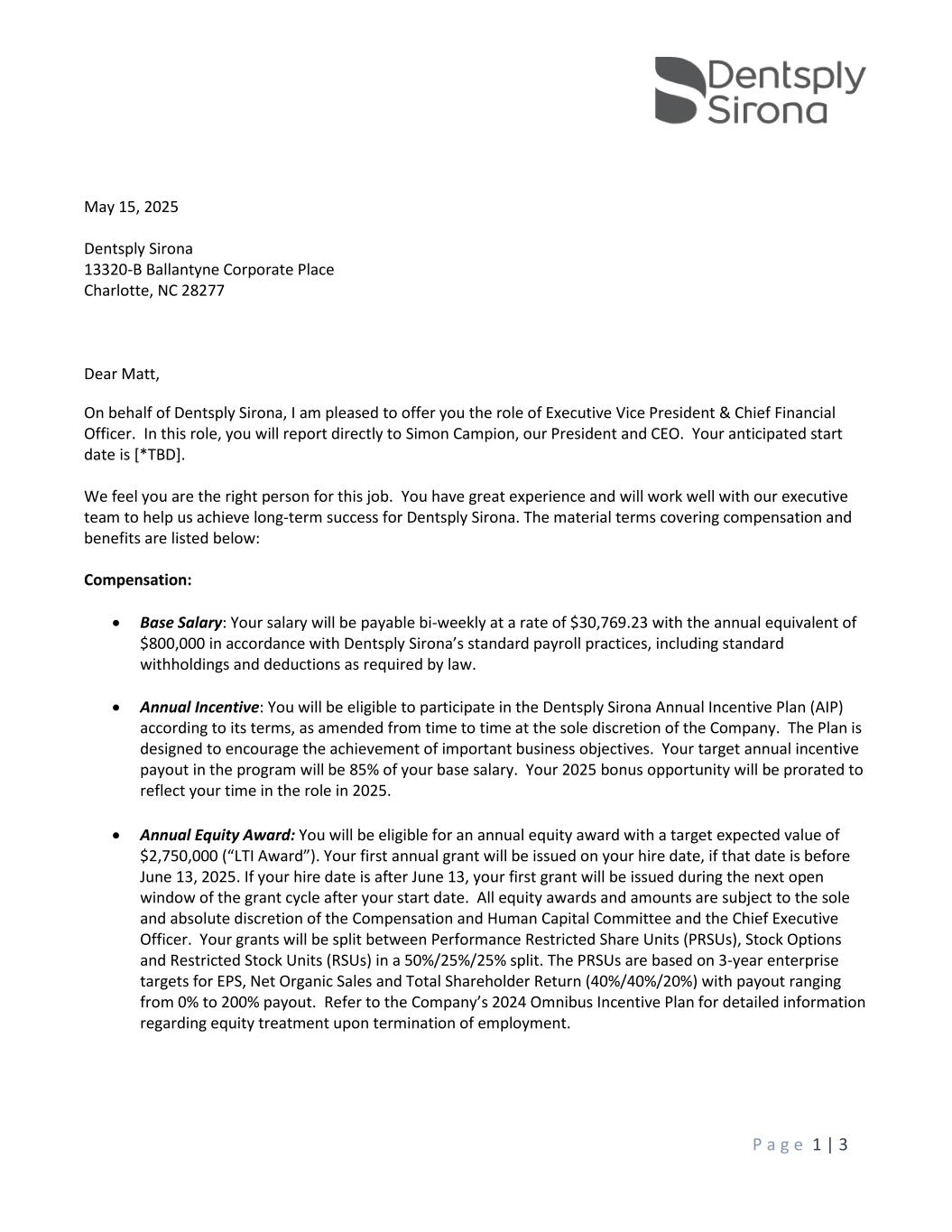 P a g e 1 | 3 May 15, 2025 Dentsply Sirona 13320-B Ballantyne Corporate Place Charlotte, NC 28277 Dear Matt, On behalf of Dentsply Sirona, I am pleased to offer you the role of Executive Vice President & Chief Financial Officer. In this role, you will report directly to Simon Campion, our President and CEO. Your anticipated start date is [*TBD]. We feel you are the right person for this job. You have great experience and will work well with our executive team to help us achieve long-term success for Dentsply Sirona. The material terms covering compensation and benefits are listed below: Compensation: • Base Salary: Your salary will be payable bi-weekly at a rate of $30,769.23 with the annual equivalent of $800,000 in accordance with Dentsply Sirona’s standard payroll practices, including standard withholdings and deductions as required by law. • Annual Incentive: You will be eligible to participate in the Dentsply Sirona Annual Incentive Plan (AIP) according to its terms, as amended from time to time at the sole discretion of the Company. The Plan is designed to encourage the achievement of important business objectives. Your target annual incentive payout in the program will be 85% of your base salary. Your 2025 bonus opportunity will be prorated to reflect your time in the role in 2025. • Annual Equity Award: You will be eligible for an annual equity award with a target expected value of $2,750,000 (“LTI Award”). Your first annual grant will be issued on your hire date, if that date is before June 13, 2025. If your hire date is after June 13, your first grant will be issued during the next open window of the grant cycle after your start date. All equity awards and amounts are subject to the sole and absolute discretion of the Compensation and Human Capital Committee and the Chief Executive Officer. Your grants will be split between Performance Restricted Share Units (PRSUs), Stock Options and Restricted Stock Units (RSUs) in a 50%/25%/25% split. The PRSUs are based on 3-year enterprise targets for EPS, Net Organic Sales and Total Shareholder Return (40%/40%/20%) with payout ranging from 0% to 200% payout. Refer to the Company’s 2024 Omnibus Incentive Plan for detailed information regarding equity treatment upon termination of employment.