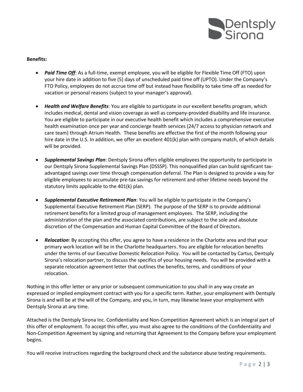P a g e 2 | 3 Benefits: • Paid Time Off: As a full-time, exempt employee, you will be eligible for Flexible Time Off (FTO) upon your hire date in addition to five (5) days of unscheduled paid time off (UPTO). Under the Company’s FTO Policy, employees do not accrue time off but instead have flexibility to take time off as needed for vacation or personal reasons (subject to your manager’s approval). • Health and Welfare Benefits: You are eligible to participate in our excellent benefits program, which includes medical, dental and vision coverage as well as company-provided disability and life insurance. You are eligible to participate in our executive health benefit which includes a comprehensive executive health examination once per year and concierge health services (24/7 access to physician network and care team) through Atrium Health. These benefits are effective the first of the month following your hire date in the U.S. In addition, we offer an excellent 401(k) plan with company match, of which details will be provided. • Supplemental Savings Plan: Dentsply Sirona offers eligible employees the opportunity to participate in our Dentsply Sirona Supplemental Savings Plan (DSSSP). This nonqualified plan can build significant tax- advantaged savings over time through compensation deferral. The Plan is designed to provide a way for eligible employees to accumulate pre-tax savings for retirement and other lifetime needs beyond the statutory limits applicable to the 401(k) plan. • Supplemental Executive Retirement Plan: You will be eligible to participate in the Company’s Supplemental Executive Retirement Plan (SERP). The purpose of the SERP is to provide additional retirement benefits for a limited group of management employees. The SERP, including the administration of the plan and the associated contributions, are subject to the sole and absolute discretion of the Compensation and Human Capital Committee of the Board of Directors. • Relocation: By accepting this offer, you agree to have a residence in the Charlotte area and that your primary work location will be in the Charlotte headquarters. You are eligible for relocation benefits under the terms of our Executive Domestic Relocation Policy. You will be contacted by Cartus, Dentsply Sirona’s relocation partner, to discuss the specifics of your housing needs. You will be provided with a separate relocation agreement letter that outlines the benefits, terms, and conditions of your relocation. Nothing in this offer letter or any prior or subsequent communication to you shall in any way create an expressed or implied employment contract with you for a specific term. Rather, your employment with Dentsply Sirona is and will be at the will of the Company, and you, in turn, may likewise leave your employment with Dentsply Sirona at any time. Attached is the Dentsply Sirona Inc. Confidentiality and Non-Competition Agreement which is an integral part of this offer of employment. To accept this offer, you must also agree to the conditions of the Confidentiality and Non-Competition Agreement by signing and returning that Agreement to the Company before your employment begins. You will receive instructions regarding the background check and the substance abuse testing requirements.