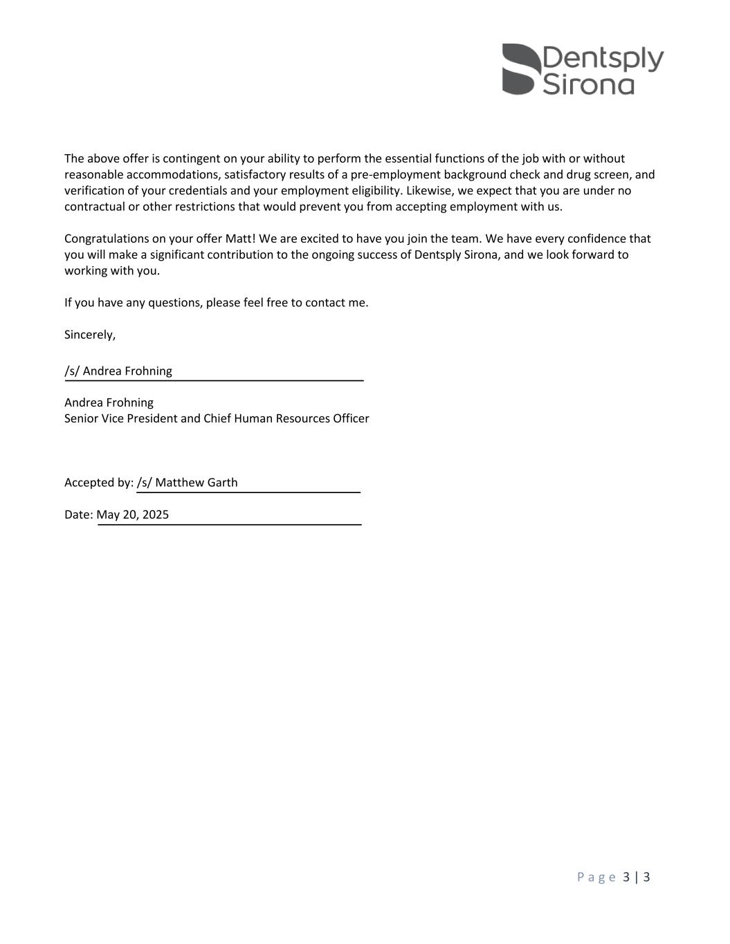 P a g e 3 | 3 The above offer is contingent on your ability to perform the essential functions of the job with or without reasonable accommodations, satisfactory results of a pre-employment background check and drug screen, and verification of your credentials and your employment eligibility. Likewise, we expect that you are under no contractual or other restrictions that would prevent you from accepting employment with us. Congratulations on your offer Matt! We are excited to have you join the team. We have every confidence that you will make a significant contribution to the ongoing success of Dentsply Sirona, and we look forward to working with you. If you have any questions, please feel free to contact me. Sincerely, Andrea Frohning Senior Vice President and Chief Human Resources Officer Accepted by: /s/ Matthew Garth Date: May 20, 2025 /s/ Andrea Frohning