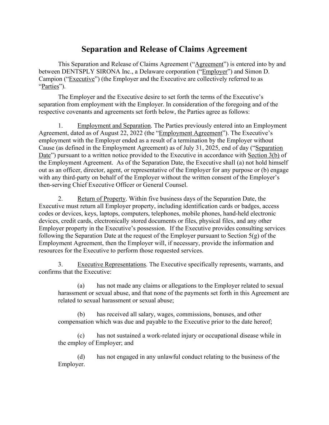 Separation and Release of Claims Agreement This Separation and Release of Claims Agreement (“Agreement”) is entered into by and between DENTSPLY SIRONA Inc., a Delaware corporation (“Employer”) and Simon D. Campion (“Executive”) (the Employer and the Executive are collectively referred to as “Parties”). The Employer and the Executive desire to set forth the terms of the Executive’s separation from employment with the Employer. In consideration of the foregoing and of the respective covenants and agreements set forth below, the Parties agree as follows: 1. Employment and Separation. The Parties previously entered into an Employment Agreement, dated as of August 22, 2022 (the “Employment Agreement”). The Executive’s employment with the Employer ended as a result of a termination by the Employer without Cause (as defined in the Employment Agreement) as of July 31, 2025, end of day (“Separation Date”) pursuant to a written notice provided to the Executive in accordance with Section 3(b) of the Employment Agreement. As of the Separation Date, the Executive shall (a) not hold himself out as an officer, director, agent, or representative of the Employer for any purpose or (b) engage with any third-party on behalf of the Employer without the written consent of the Employer’s then-serving Chief Executive Officer or General Counsel. 2. Return of Property. Within five business days of the Separation Date, the Executive must return all Employer property, including identification cards or badges, access codes or devices, keys, laptops, computers, telephones, mobile phones, hand-held electronic devices, credit cards, electronically stored documents or files, physical files, and any other Employer property in the Executive’s possession. If the Executive provides consulting services following the Separation Date at the request of the Employer pursuant to Section 5(g) of the Employment Agreement, then the Employer will, if necessary, provide the information and resources for the Executive to perform those requested services. 3. Executive Representations. The Executive specifically represents, warrants, and confirms that the Executive: (a) has not made any claims or allegations to the Employer related to sexual harassment or sexual abuse, and that none of the payments set forth in this Agreement are related to sexual harassment or sexual abuse; (b) has received all salary, wages, commissions, bonuses, and other compensation which was due and payable to the Executive prior to the date hereof; (c) has not sustained a work-related injury or occupational disease while in the employ of Employer; and (d) has not engaged in any unlawful conduct relating to the business of the Employer.
