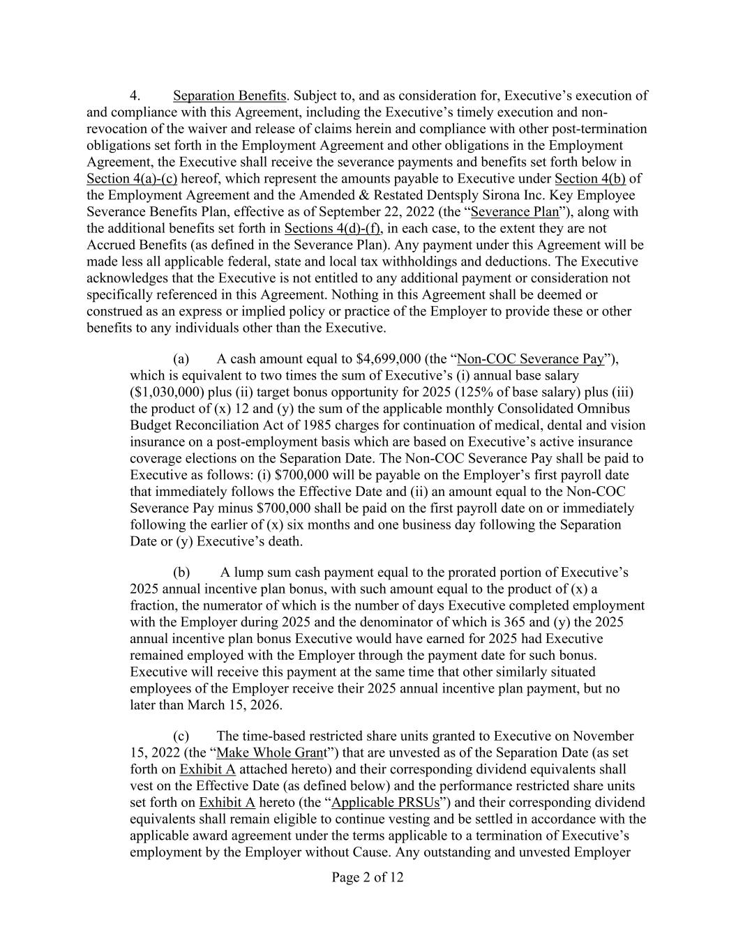 Page 2 of 12 4. Separation Benefits. Subject to, and as consideration for, Executive’s execution of and compliance with this Agreement, including the Executive’s timely execution and non- revocation of the waiver and release of claims herein and compliance with other post-termination obligations set forth in the Employment Agreement and other obligations in the Employment Agreement, the Executive shall receive the severance payments and benefits set forth below in Section 4(a)-(c) hereof, which represent the amounts payable to Executive under Section 4(b) of the Employment Agreement and the Amended & Restated Dentsply Sirona Inc. Key Employee Severance Benefits Plan, effective as of September 22, 2022 (the “Severance Plan”), along with the additional benefits set forth in Sections 4(d)-(f), in each case, to the extent they are not Accrued Benefits (as defined in the Severance Plan). Any payment under this Agreement will be made less all applicable federal, state and local tax withholdings and deductions. The Executive acknowledges that the Executive is not entitled to any additional payment or consideration not specifically referenced in this Agreement. Nothing in this Agreement shall be deemed or construed as an express or implied policy or practice of the Employer to provide these or other benefits to any individuals other than the Executive. (a) A cash amount equal to $4,699,000 (the “Non-COC Severance Pay”), which is equivalent to two times the sum of Executive’s (i) annual base salary ($1,030,000) plus (ii) target bonus opportunity for 2025 (125% of base salary) plus (iii) the product of (x) 12 and (y) the sum of the applicable monthly Consolidated Omnibus Budget Reconciliation Act of 1985 charges for continuation of medical, dental and vision insurance on a post-employment basis which are based on Executive’s active insurance coverage elections on the Separation Date. The Non-COC Severance Pay shall be paid to Executive as follows: (i) $700,000 will be payable on the Employer’s first payroll date that immediately follows the Effective Date and (ii) an amount equal to the Non-COC Severance Pay minus $700,000 shall be paid on the first payroll date on or immediately following the earlier of (x) six months and one business day following the Separation Date or (y) Executive’s death. (b) A lump sum cash payment equal to the prorated portion of Executive’s 2025 annual incentive plan bonus, with such amount equal to the product of (x) a fraction, the numerator of which is the number of days Executive completed employment with the Employer during 2025 and the denominator of which is 365 and (y) the 2025 annual incentive plan bonus Executive would have earned for 2025 had Executive remained employed with the Employer through the payment date for such bonus. Executive will receive this payment at the same time that other similarly situated employees of the Employer receive their 2025 annual incentive plan payment, but no later than March 15, 2026. (c) The time-based restricted share units granted to Executive on November 15, 2022 (the “Make Whole Grant”) that are unvested as of the Separation Date (as set forth on Exhibit A attached hereto) and their corresponding dividend equivalents shall vest on the Effective Date (as defined below) and the performance restricted share units set forth on Exhibit A hereto (the “Applicable PRSUs”) and their corresponding dividend equivalents shall remain eligible to continue vesting and be settled in accordance with the applicable award agreement under the terms applicable to a termination of Executive’s employment by the Employer without Cause. Any outstanding and unvested Employer