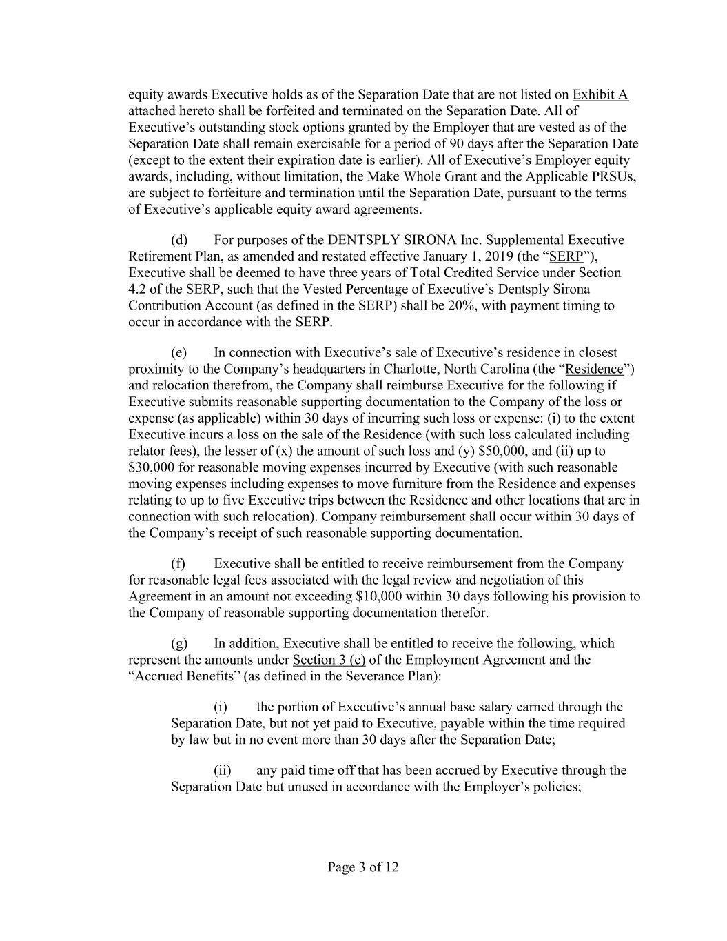 Page 3 of 12 equity awards Executive holds as of the Separation Date that are not listed on Exhibit A attached hereto shall be forfeited and terminated on the Separation Date. All of Executive’s outstanding stock options granted by the Employer that are vested as of the Separation Date shall remain exercisable for a period of 90 days after the Separation Date (except to the extent their expiration date is earlier). All of Executive’s Employer equity awards, including, without limitation, the Make Whole Grant and the Applicable PRSUs, are subject to forfeiture and termination until the Separation Date, pursuant to the terms of Executive’s applicable equity award agreements. (d) For purposes of the DENTSPLY SIRONA Inc. Supplemental Executive Retirement Plan, as amended and restated effective January 1, 2019 (the “SERP”), Executive shall be deemed to have three years of Total Credited Service under Section 4.2 of the SERP, such that the Vested Percentage of Executive’s Dentsply Sirona Contribution Account (as defined in the SERP) shall be 20%, with payment timing to occur in accordance with the SERP. (e) In connection with Executive’s sale of Executive’s residence in closest proximity to the Company’s headquarters in Charlotte, North Carolina (the “Residence”) and relocation therefrom, the Company shall reimburse Executive for the following if Executive submits reasonable supporting documentation to the Company of the loss or expense (as applicable) within 30 days of incurring such loss or expense: (i) to the extent Executive incurs a loss on the sale of the Residence (with such loss calculated including relator fees), the lesser of (x) the amount of such loss and (y) $50,000, and (ii) up to $30,000 for reasonable moving expenses incurred by Executive (with such reasonable moving expenses including expenses to move furniture from the Residence and expenses relating to up to five Executive trips between the Residence and other locations that are in connection with such relocation). Company reimbursement shall occur within 30 days of the Company’s receipt of such reasonable supporting documentation. (f) Executive shall be entitled to receive reimbursement from the Company for reasonable legal fees associated with the legal review and negotiation of this Agreement in an amount not exceeding $10,000 within 30 days following his provision to the Company of reasonable supporting documentation therefor. (g) In addition, Executive shall be entitled to receive the following, which represent the amounts under Section 3 (c) of the Employment Agreement and the “Accrued Benefits” (as defined in the Severance Plan): (i) the portion of Executive’s annual base salary earned through the Separation Date, but not yet paid to Executive, payable within the time required by law but in no event more than 30 days after the Separation Date; (ii) any paid time off that has been accrued by Executive through the Separation Date but unused in accordance with the Employer’s policies;
