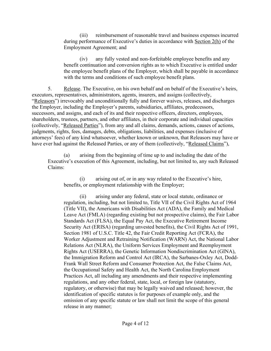 Page 4 of 12 (iii) reimbursement of reasonable travel and business expenses incurred during performance of Executive’s duties in accordance with Section 2(h) of the Employment Agreement; and (iv) any fully vested and non-forfeitable employee benefits and any benefit continuation and conversion rights as to which Executive is entitled under the employee benefit plans of the Employer, which shall be payable in accordance with the terms and conditions of such employee benefit plans. 5. Release. The Executive, on his own behalf and on behalf of the Executive’s heirs, executors, representatives, administrators, agents, insurers, and assigns (collectively, “Releasors”) irrevocably and unconditionally fully and forever waives, releases, and discharges the Employer, including the Employer’s parents, subsidiaries, affiliates, predecessors, successors, and assigns, and each of its and their respective officers, directors, employees, shareholders, trustees, partners, and other affiliates, in their corporate and individual capacities (collectively, “Released Parties”), from any and all claims, demands, actions, causes of actions, judgments, rights, fees, damages, debts, obligations, liabilities, and expenses (inclusive of attorneys’ fees) of any kind whatsoever, whether known or unknown, that Releasors may have or have ever had against the Released Parties, or any of them (collectively, “Released Claims”), (a) arising from the beginning of time up to and including the date of the Executive’s execution of this Agreement, including, but not limited to, any such Released Claims: (i) arising out of, or in any way related to the Executive’s hire, benefits, or employment relationship with the Employer; (ii) arising under any federal, state or local statute, ordinance or regulation, including, but not limited to, Title VII of the Civil Rights Act of 1964 (Title VII), the Americans with Disabilities Act (ADA), the Family and Medical Leave Act (FMLA) (regarding existing but not prospective claims), the Fair Labor Standards Act (FLSA), the Equal Pay Act, the Executive Retirement Income Security Act (ERISA) (regarding unvested benefits), the Civil Rights Act of 1991, Section 1981 of U.S.C. Title 42, the Fair Credit Reporting Act (FCRA), the Worker Adjustment and Retraining Notification (WARN) Act, the National Labor Relations Act (NLRA), the Uniform Services Employment and Reemployment Rights Act (USERRA), the Genetic Information Nondiscrimination Act (GINA), the Immigration Reform and Control Act (IRCA), the Sarbanes-Oxley Act, Dodd- Frank Wall Street Reform and Consumer Protection Act, the False Claims Act, the Occupational Safety and Health Act, the North Carolina Employment Practices Act, all including any amendments and their respective implementing regulations, and any other federal, state, local, or foreign law (statutory, regulatory, or otherwise) that may be legally waived and released; however, the identification of specific statutes is for purposes of example only, and the omission of any specific statute or law shall not limit the scope of this general release in any manner;