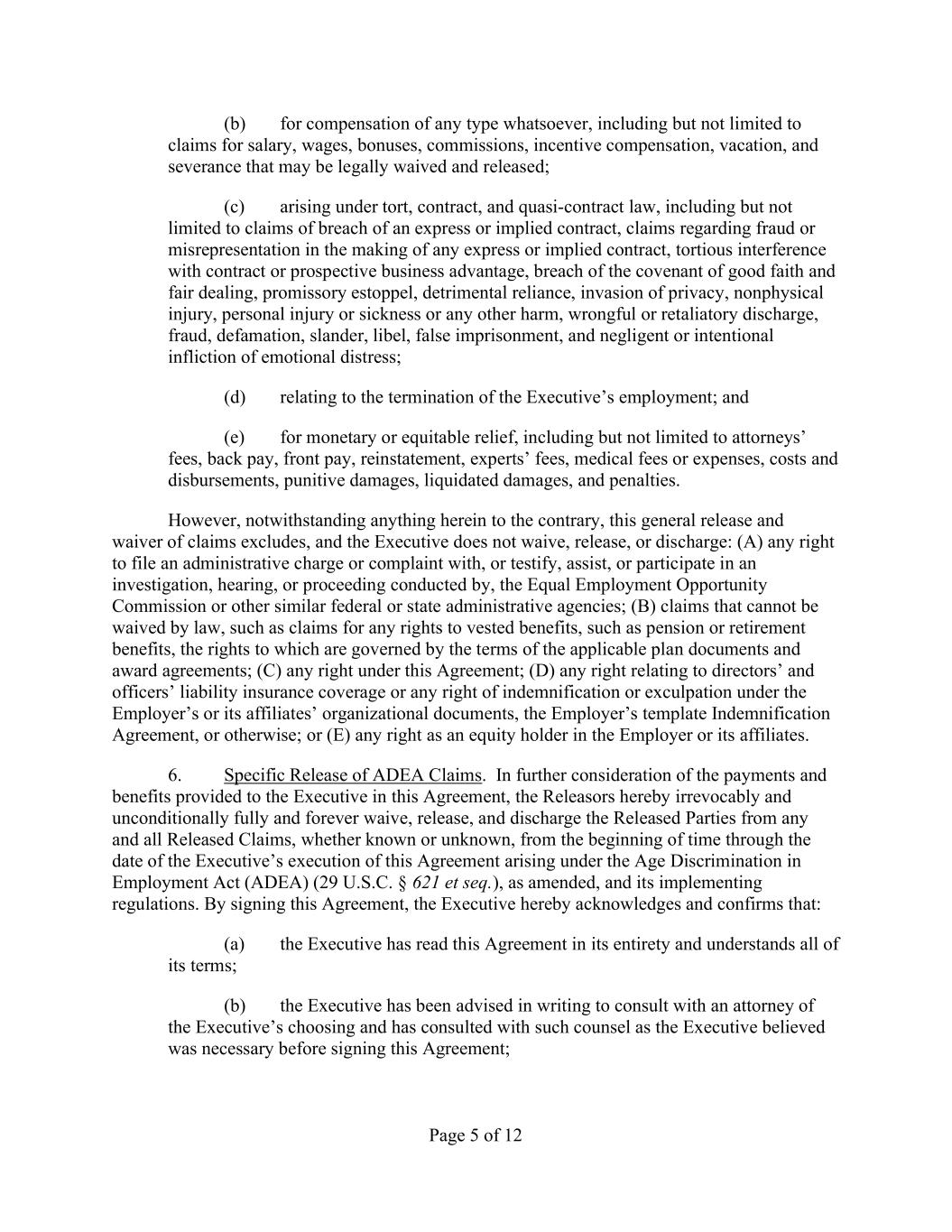 Page 5 of 12 (b) for compensation of any type whatsoever, including but not limited to claims for salary, wages, bonuses, commissions, incentive compensation, vacation, and severance that may be legally waived and released; (c) arising under tort, contract, and quasi-contract law, including but not limited to claims of breach of an express or implied contract, claims regarding fraud or misrepresentation in the making of any express or implied contract, tortious interference with contract or prospective business advantage, breach of the covenant of good faith and fair dealing, promissory estoppel, detrimental reliance, invasion of privacy, nonphysical injury, personal injury or sickness or any other harm, wrongful or retaliatory discharge, fraud, defamation, slander, libel, false imprisonment, and negligent or intentional infliction of emotional distress; (d) relating to the termination of the Executive’s employment; and (e) for monetary or equitable relief, including but not limited to attorneys’ fees, back pay, front pay, reinstatement, experts’ fees, medical fees or expenses, costs and disbursements, punitive damages, liquidated damages, and penalties. However, notwithstanding anything herein to the contrary, this general release and waiver of claims excludes, and the Executive does not waive, release, or discharge: (A) any right to file an administrative charge or complaint with, or testify, assist, or participate in an investigation, hearing, or proceeding conducted by, the Equal Employment Opportunity Commission or other similar federal or state administrative agencies; (B) claims that cannot be waived by law, such as claims for any rights to vested benefits, such as pension or retirement benefits, the rights to which are governed by the terms of the applicable plan documents and award agreements; (C) any right under this Agreement; (D) any right relating to directors’ and officers’ liability insurance coverage or any right of indemnification or exculpation under the Employer’s or its affiliates’ organizational documents, the Employer’s template Indemnification Agreement, or otherwise; or (E) any right as an equity holder in the Employer or its affiliates. 6. Specific Release of ADEA Claims. In further consideration of the payments and benefits provided to the Executive in this Agreement, the Releasors hereby irrevocably and unconditionally fully and forever waive, release, and discharge the Released Parties from any and all Released Claims, whether known or unknown, from the beginning of time through the date of the Executive’s execution of this Agreement arising under the Age Discrimination in Employment Act (ADEA) (29 U.S.C. § 621 et seq.), as amended, and its implementing regulations. By signing this Agreement, the Executive hereby acknowledges and confirms that: (a) the Executive has read this Agreement in its entirety and understands all of its terms; (b) the Executive has been advised in writing to consult with an attorney of the Executive’s choosing and has consulted with such counsel as the Executive believed was necessary before signing this Agreement;