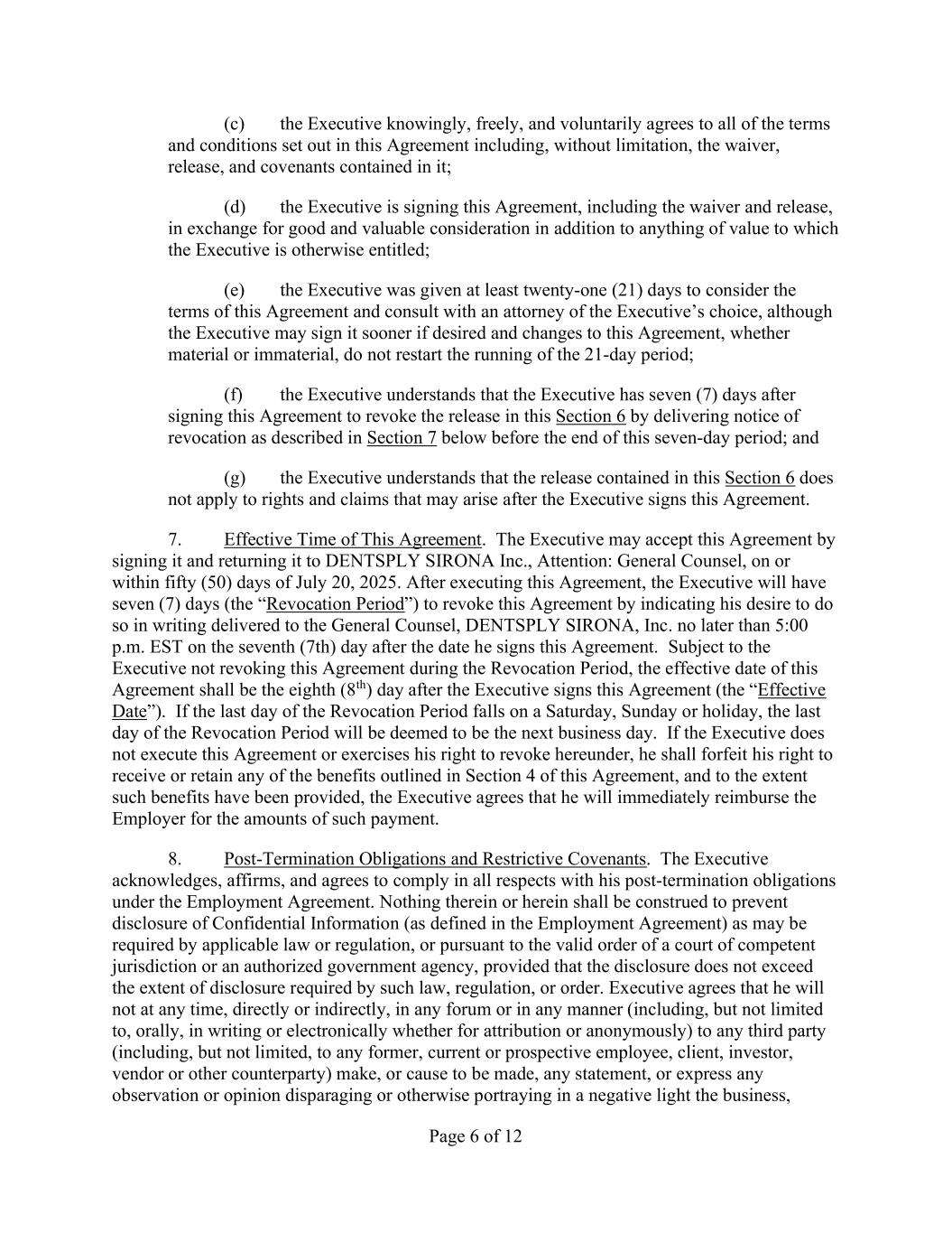 Page 6 of 12 (c) the Executive knowingly, freely, and voluntarily agrees to all of the terms and conditions set out in this Agreement including, without limitation, the waiver, release, and covenants contained in it; (d) the Executive is signing this Agreement, including the waiver and release, in exchange for good and valuable consideration in addition to anything of value to which the Executive is otherwise entitled; (e) the Executive was given at least twenty-one (21) days to consider the terms of this Agreement and consult with an attorney of the Executive’s choice, although the Executive may sign it sooner if desired and changes to this Agreement, whether material or immaterial, do not restart the running of the 21-day period; (f) the Executive understands that the Executive has seven (7) days after signing this Agreement to revoke the release in this Section 6 by delivering notice of revocation as described in Section 7 below before the end of this seven-day period; and (g) the Executive understands that the release contained in this Section 6 does not apply to rights and claims that may arise after the Executive signs this Agreement. 7. Effective Time of This Agreement. The Executive may accept this Agreement by signing it and returning it to DENTSPLY SIRONA Inc., Attention: General Counsel, on or within fifty (50) days of July 20, 2025. After executing this Agreement, the Executive will have seven (7) days (the “Revocation Period”) to revoke this Agreement by indicating his desire to do so in writing delivered to the General Counsel, DENTSPLY SIRONA, Inc. no later than 5:00 p.m. EST on the seventh (7th) day after the date he signs this Agreement. Subject to the Executive not revoking this Agreement during the Revocation Period, the effective date of this Agreement shall be the eighth (8th) day after the Executive signs this Agreement (the “Effective Date”). If the last day of the Revocation Period falls on a Saturday, Sunday or holiday, the last day of the Revocation Period will be deemed to be the next business day. If the Executive does not execute this Agreement or exercises his right to revoke hereunder, he shall forfeit his right to receive or retain any of the benefits outlined in Section 4 of this Agreement, and to the extent such benefits have been provided, the Executive agrees that he will immediately reimburse the Employer for the amounts of such payment. 8. Post-Termination Obligations and Restrictive Covenants. The Executive acknowledges, affirms, and agrees to comply in all respects with his post-termination obligations under the Employment Agreement. Nothing therein or herein shall be construed to prevent disclosure of Confidential Information (as defined in the Employment Agreement) as may be required by applicable law or regulation, or pursuant to the valid order of a court of competent jurisdiction or an authorized government agency, provided that the disclosure does not exceed the extent of disclosure required by such law, regulation, or order. Executive agrees that he will not at any time, directly or indirectly, in any forum or in any manner (including, but not limited to, orally, in writing or electronically whether for attribution or anonymously) to any third party (including, but not limited, to any former, current or prospective employee, client, investor, vendor or other counterparty) make, or cause to be made, any statement, or express any observation or opinion disparaging or otherwise portraying in a negative light the business,
