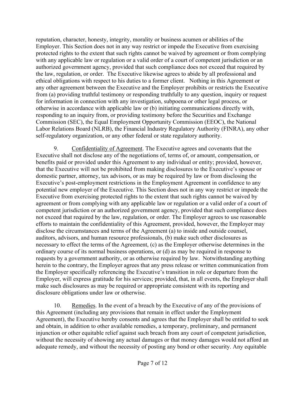Page 7 of 12 reputation, character, honesty, integrity, morality or business acumen or abilities of the Employer. This Section does not in any way restrict or impede the Executive from exercising protected rights to the extent that such rights cannot be waived by agreement or from complying with any applicable law or regulation or a valid order of a court of competent jurisdiction or an authorized government agency, provided that such compliance does not exceed that required by the law, regulation, or order. The Executive likewise agrees to abide by all professional and ethical obligations with respect to his duties to a former client. Nothing in this Agreement or any other agreement between the Executive and the Employer prohibits or restricts the Executive from (a) providing truthful testimony or responding truthfully to any question, inquiry or request for information in connection with any investigation, subpoena or other legal process, or otherwise in accordance with applicable law or (b) initiating communications directly with, responding to an inquiry from, or providing testimony before the Securities and Exchange Commission (SEC), the Equal Employment Opportunity Commission (EEOC), the National Labor Relations Board (NLRB), the Financial Industry Regulatory Authority (FINRA), any other self-regulatory organization, or any other federal or state regulatory authority. 9. Confidentiality of Agreement. The Executive agrees and covenants that the Executive shall not disclose any of the negotiations of, terms of, or amount, compensation, or benefits paid or provided under this Agreement to any individual or entity; provided, however, that the Executive will not be prohibited from making disclosures to the Executive’s spouse or domestic partner, attorney, tax advisors, or as may be required by law or from disclosing the Executive’s post-employment restrictions in the Employment Agreement in confidence to any potential new employer of the Executive. This Section does not in any way restrict or impede the Executive from exercising protected rights to the extent that such rights cannot be waived by agreement or from complying with any applicable law or regulation or a valid order of a court of competent jurisdiction or an authorized government agency, provided that such compliance does not exceed that required by the law, regulation, or order. The Employer agrees to use reasonable efforts to maintain the confidentiality of this Agreement, provided, however, the Employer may disclose the circumstances and terms of the Agreement (a) to inside and outside counsel, auditors, advisors, and human resource professionals, (b) make such other disclosures as necessary to effect the terms of the Agreement, (c) as the Employer otherwise determines in the ordinary course of its normal business operations, or (d) as may be required in response to requests by a government authority, or as otherwise required by law. Notwithstanding anything herein to the contrary, the Employer agrees that any press release or written communication from the Employer specifically referencing the Executive’s transition in role or departure from the Employer, will express gratitude for his services; provided, that, in all events, the Employer shall make such disclosures as may be required or appropriate consistent with its reporting and disclosure obligations under law or otherwise. 10. Remedies. In the event of a breach by the Executive of any of the provisions of this Agreement (including any provisions that remain in effect under the Employment Agreement), the Executive hereby consents and agrees that the Employer shall be entitled to seek and obtain, in addition to other available remedies, a temporary, preliminary, and permanent injunction or other equitable relief against such breach from any court of competent jurisdiction, without the necessity of showing any actual damages or that money damages would not afford an adequate remedy, and without the necessity of posting any bond or other security. Any equitable