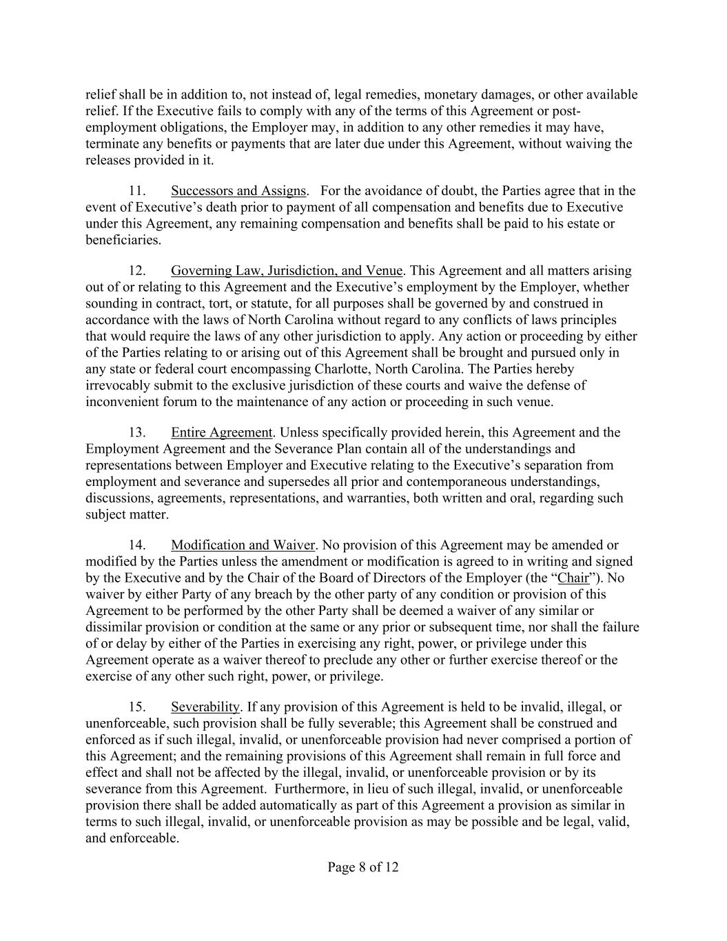 Page 8 of 12 relief shall be in addition to, not instead of, legal remedies, monetary damages, or other available relief. If the Executive fails to comply with any of the terms of this Agreement or post- employment obligations, the Employer may, in addition to any other remedies it may have, terminate any benefits or payments that are later due under this Agreement, without waiving the releases provided in it. 11. Successors and Assigns. For the avoidance of doubt, the Parties agree that in the event of Executive’s death prior to payment of all compensation and benefits due to Executive under this Agreement, any remaining compensation and benefits shall be paid to his estate or beneficiaries. 12. Governing Law, Jurisdiction, and Venue. This Agreement and all matters arising out of or relating to this Agreement and the Executive’s employment by the Employer, whether sounding in contract, tort, or statute, for all purposes shall be governed by and construed in accordance with the laws of North Carolina without regard to any conflicts of laws principles that would require the laws of any other jurisdiction to apply. Any action or proceeding by either of the Parties relating to or arising out of this Agreement shall be brought and pursued only in any state or federal court encompassing Charlotte, North Carolina. The Parties hereby irrevocably submit to the exclusive jurisdiction of these courts and waive the defense of inconvenient forum to the maintenance of any action or proceeding in such venue. 13. Entire Agreement. Unless specifically provided herein, this Agreement and the Employment Agreement and the Severance Plan contain all of the understandings and representations between Employer and Executive relating to the Executive’s separation from employment and severance and supersedes all prior and contemporaneous understandings, discussions, agreements, representations, and warranties, both written and oral, regarding such subject matter. 14. Modification and Waiver. No provision of this Agreement may be amended or modified by the Parties unless the amendment or modification is agreed to in writing and signed by the Executive and by the Chair of the Board of Directors of the Employer (the “Chair”). No waiver by either Party of any breach by the other party of any condition or provision of this Agreement to be performed by the other Party shall be deemed a waiver of any similar or dissimilar provision or condition at the same or any prior or subsequent time, nor shall the failure of or delay by either of the Parties in exercising any right, power, or privilege under this Agreement operate as a waiver thereof to preclude any other or further exercise thereof or the exercise of any other such right, power, or privilege. 15. Severability. If any provision of this Agreement is held to be invalid, illegal, or unenforceable, such provision shall be fully severable; this Agreement shall be construed and enforced as if such illegal, invalid, or unenforceable provision had never comprised a portion of this Agreement; and the remaining provisions of this Agreement shall remain in full force and effect and shall not be affected by the illegal, invalid, or unenforceable provision or by its severance from this Agreement. Furthermore, in lieu of such illegal, invalid, or unenforceable provision there shall be added automatically as part of this Agreement a provision as similar in terms to such illegal, invalid, or unenforceable provision as may be possible and be legal, valid, and enforceable.