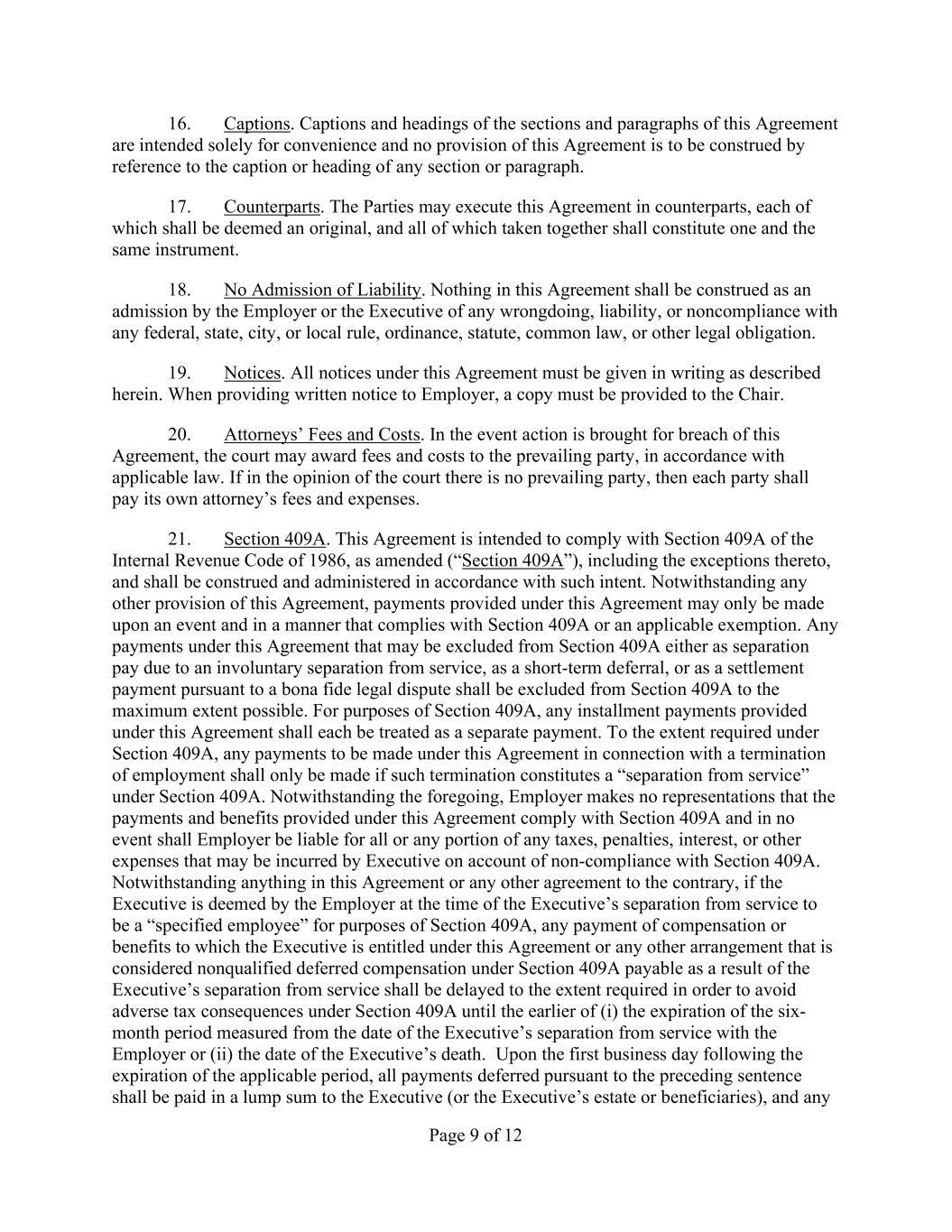 Page 9 of 12 16. Captions. Captions and headings of the sections and paragraphs of this Agreement are intended solely for convenience and no provision of this Agreement is to be construed by reference to the caption or heading of any section or paragraph. 17. Counterparts. The Parties may execute this Agreement in counterparts, each of which shall be deemed an original, and all of which taken together shall constitute one and the same instrument. 18. No Admission of Liability. Nothing in this Agreement shall be construed as an admission by the Employer or the Executive of any wrongdoing, liability, or noncompliance with any federal, state, city, or local rule, ordinance, statute, common law, or other legal obligation. 19. Notices. All notices under this Agreement must be given in writing as described herein. When providing written notice to Employer, a copy must be provided to the Chair. 20. Attorneys’ Fees and Costs. In the event action is brought for breach of this Agreement, the court may award fees and costs to the prevailing party, in accordance with applicable law. If in the opinion of the court there is no prevailing party, then each party shall pay its own attorney’s fees and expenses. 21. Section 409A. This Agreement is intended to comply with Section 409A of the Internal Revenue Code of 1986, as amended (“Section 409A”), including the exceptions thereto, and shall be construed and administered in accordance with such intent. Notwithstanding any other provision of this Agreement, payments provided under this Agreement may only be made upon an event and in a manner that complies with Section 409A or an applicable exemption. Any payments under this Agreement that may be excluded from Section 409A either as separation pay due to an involuntary separation from service, as a short-term deferral, or as a settlement payment pursuant to a bona fide legal dispute shall be excluded from Section 409A to the maximum extent possible. For purposes of Section 409A, any installment payments provided under this Agreement shall each be treated as a separate payment. To the extent required under Section 409A, any payments to be made under this Agreement in connection with a termination of employment shall only be made if such termination constitutes a “separation from service” under Section 409A. Notwithstanding the foregoing, Employer makes no representations that the payments and benefits provided under this Agreement comply with Section 409A and in no event shall Employer be liable for all or any portion of any taxes, penalties, interest, or other expenses that may be incurred by Executive on account of non-compliance with Section 409A. Notwithstanding anything in this Agreement or any other agreement to the contrary, if the Executive is deemed by the Employer at the time of the Executive’s separation from service to be a “specified employee” for purposes of Section 409A, any payment of compensation or benefits to which the Executive is entitled under this Agreement or any other arrangement that is considered nonqualified deferred compensation under Section 409A payable as a result of the Executive’s separation from service shall be delayed to the extent required in order to avoid adverse tax consequences under Section 409A until the earlier of (i) the expiration of the six- month period measured from the date of the Executive’s separation from service with the Employer or (ii) the date of the Executive’s death. Upon the first business day following the expiration of the applicable period, all payments deferred pursuant to the preceding sentence shall be paid in a lump sum to the Executive (or the Executive’s estate or beneficiaries), and any