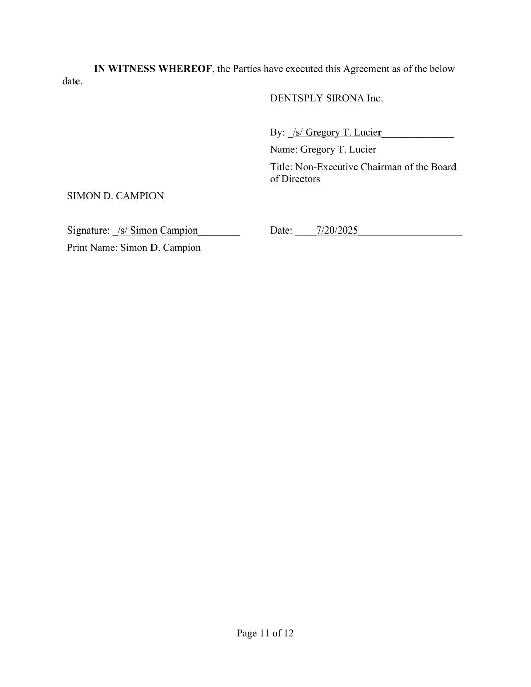 Page 11 of 12 IN WITNESS WHEREOF, the Parties have executed this Agreement as of the below date. DENTSPLY SIRONA Inc. By: _/s/ Gregory T. Lucier______________ Name: Gregory T. Lucier Title: Non-Executive Chairman of the Board of Directors SIMON D. CAMPION Signature: _/s/ Simon Campion________ Print Name: Simon D. Campion Date: ____7/20/2025____________________