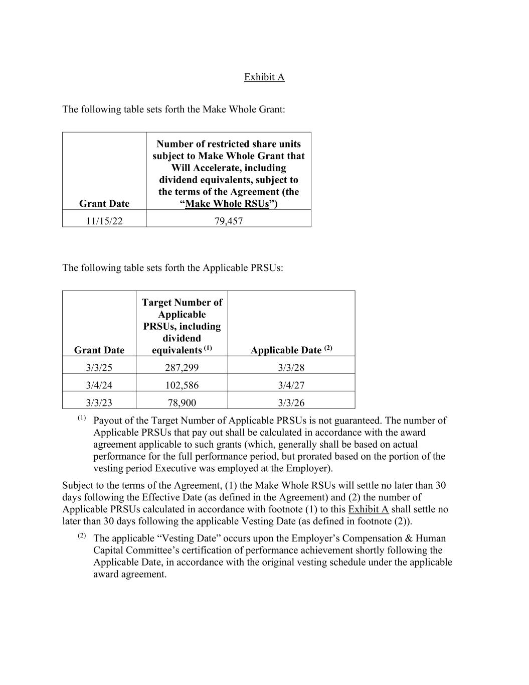 Exhibit A The following table sets forth the Make Whole Grant: Grant Date Number of restricted share units subject to Make Whole Grant that Will Accelerate, including dividend equivalents, subject to the terms of the Agreement (the “Make Whole RSUs”) 11/15/22 79,457 The following table sets forth the Applicable PRSUs: Grant Date Target Number of Applicable PRSUs, including dividend equivalents (1) Applicable Date (2) 3/3/25 287,299 3/3/28 3/4/24 102,586 3/4/27 3/3/23 78,900 3/3/26 (1) Payout of the Target Number of Applicable PRSUs is not guaranteed. The number of Applicable PRSUs that pay out shall be calculated in accordance with the award agreement applicable to such grants (which, generally shall be based on actual performance for the full performance period, but prorated based on the portion of the vesting period Executive was employed at the Employer). Subject to the terms of the Agreement, (1) the Make Whole RSUs will settle no later than 30 days following the Effective Date (as defined in the Agreement) and (2) the number of Applicable PRSUs calculated in accordance with footnote (1) to this Exhibit A shall settle no later than 30 days following the applicable Vesting Date (as defined in footnote (2)). (2) The applicable “Vesting Date” occurs upon the Employer’s Compensation & Human Capital Committee’s certification of performance achievement shortly following the Applicable Date, in accordance with the original vesting schedule under the applicable award agreement.