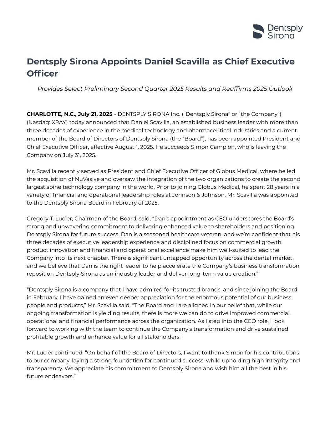 Dentsply Sirona Appoints Daniel Scavilla as Chief Executive Officer Provides Select Preliminary Second Quarter 2025 Results and Reaffirms 2025 Outlook CHARLOTTE, N.C., July 21, 2025 - DENTSPLY SIRONA Inc. (“Dentsply Sirona” or “the Company”) (Nasdaq: XRAY) today announced that Daniel Scavilla, an established business leader with more than three decades of experience in the medical technology and pharmaceutical industries and a current member of the Board of Directors of Dentsply Sirona (the “Board”), has been appointed President and Chief Executive Officer, effective August 1, 2025. He succeeds Simon Campion, who is leaving the Company on July 31, 2025. Mr. Scavilla recently served as President and Chief Executive Officer of Globus Medical, where he led the acquisition of NuVasive and oversaw the integration of the two organizations to create the second largest spine technology company in the world. Prior to joining Globus Medical, he spent 28 years in a variety of financial and operational leadership roles at Johnson & Johnson. Mr. Scavilla was appointed to the Dentsply Sirona Board in February of 2025. Gregory T. Lucier, Chairman of the Board, said, “Dan’s appointment as CEO underscores the Board’s strong and unwavering commitment to delivering enhanced value to shareholders and positioning Dentsply Sirona for future success. Dan is a seasoned healthcare veteran, and we’re confident that his three decades of executive leadership experience and disciplined focus on commercial growth, product innovation and financial and operational excellence make him well-suited to lead the Company into its next chapter. There is significant untapped opportunity across the dental market, and we believe that Dan is the right leader to help accelerate the Company’s business transformation, reposition Dentsply Sirona as an industry leader and deliver long-term value creation.” “Dentsply Sirona is a company that I have admired for its trusted brands, and since joining the Board in February, I have gained an even deeper appreciation for the enormous potential of our business, people and products,” Mr. Scavilla said. “The Board and I are aligned in our belief that, while our ongoing transformation is yielding results, there is more we can do to drive improved commercial, operational and financial performance across the organization. As I step into the CEO role, I look forward to working with the team to continue the Company’s transformation and drive sustained profitable growth and enhance value for all stakeholders.” Mr. Lucier continued, “On behalf of the Board of Directors, I want to thank Simon for his contributions to our company, laying a strong foundation for continued success, while upholding high integrity and transparency. We appreciate his commitment to Dentsply Sirona and wish him all the best in his future endeavors.”