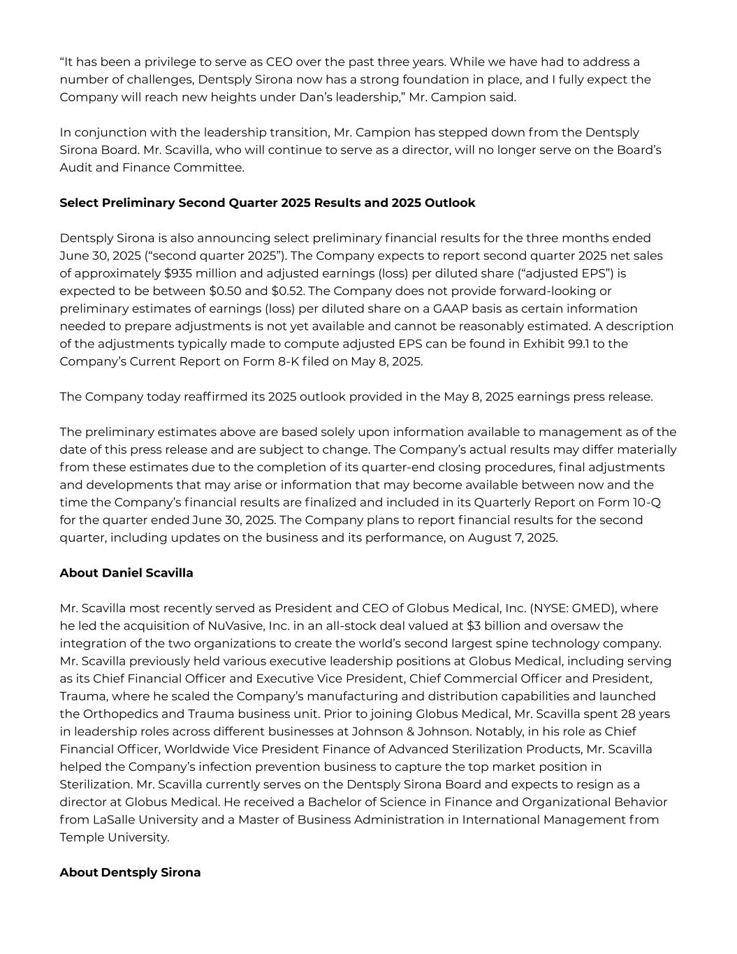 “It has been a privilege to serve as CEO over the past three years. While we have had to address a number of challenges, Dentsply Sirona now has a strong foundation in place, and I fully expect the Company will reach new heights under Dan’s leadership,” Mr. Campion said. In conjunction with the leadership transition, Mr. Campion has stepped down from the Dentsply Sirona Board. Mr. Scavilla, who will continue to serve as a director, will no longer serve on the Board’s Audit and Finance Committee. Select Preliminary Second Quarter 2025 Results and 2025 Outlook Dentsply Sirona is also announcing select preliminary financial results for the three months ended June 30, 2025 (“second quarter 2025”). The Company expects to report second quarter 2025 net sales of approximately $935 million and adjusted earnings (loss) per diluted share (“adjusted EPS”) is expected to be between $0.50 and $0.52. The Company does not provide forward-looking or preliminary estimates of earnings (loss) per diluted share on a GAAP basis as certain information needed to prepare adjustments is not yet available and cannot be reasonably estimated. A description of the adjustments typically made to compute adjusted EPS can be found in Exhibit 99.1 to the Company’s Current Report on Form 8-K filed on May 8, 2025. The Company today reaffirmed its 2025 outlook provided in the May 8, 2025 earnings press release. The preliminary estimates above are based solely upon information available to management as of the date of this press release and are subject to change. The Company’s actual results may differ materially from these estimates due to the completion of its quarter-end closing procedures, final adjustments and developments that may arise or information that may become available between now and the time the Company’s financial results are finalized and included in its Quarterly Report on Form 10-Q for the quarter ended June 30, 2025. The Company plans to report financial results for the second quarter, including updates on the business and its performance, on August 7, 2025. About Daniel Scavilla Mr. Scavilla most recently served as President and CEO of Globus Medical, Inc. (NYSE: GMED), where he led the acquisition of NuVasive, Inc. in an all-stock deal valued at $3 billion and oversaw the integration of the two organizations to create the world’s second largest spine technology company. Mr. Scavilla previously held various executive leadership positions at Globus Medical, including serving as its Chief Financial Officer and Executive Vice President, Chief Commercial Officer and President, Trauma, where he scaled the Company’s manufacturing and distribution capabilities and launched the Orthopedics and Trauma business unit. Prior to joining Globus Medical, Mr. Scavilla spent 28 years in leadership roles across different businesses at Johnson & Johnson. Notably, in his role as Chief Financial Officer, Worldwide Vice President Finance of Advanced Sterilization Products, Mr. Scavilla helped the Company’s infection prevention business to capture the top market position in Sterilization. Mr. Scavilla currently serves on the Dentsply Sirona Board and expects to resign as a director at Globus Medical. He received a Bachelor of Science in Finance and Organizational Behavior from LaSalle University and a Master of Business Administration in International Management from Temple University. About Dentsply Sirona