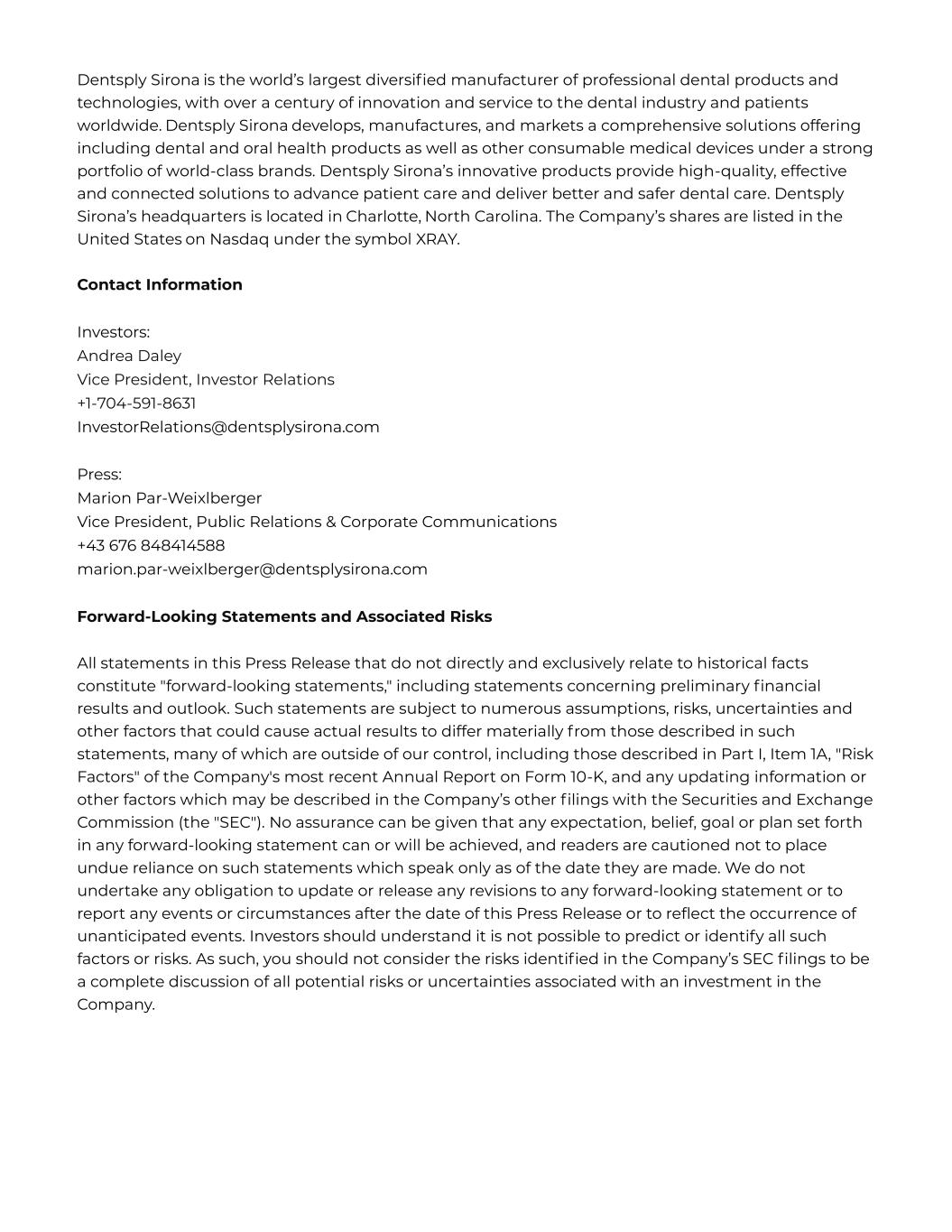 Dentsply Sirona is the world’s largest diversified manufacturer of professional dental products and technologies, with over a century of innovation and service to the dental industry and patients worldwide. Dentsply Sirona develops, manufactures, and markets a comprehensive solutions offering including dental and oral health products as well as other consumable medical devices under a strong portfolio of world-class brands. Dentsply Sirona’s innovative products provide high-quality, effective and connected solutions to advance patient care and deliver better and safer dental care. Dentsply Sirona’s headquarters is located in Charlotte, North Carolina. The Company’s shares are listed in the United States on Nasdaq under the symbol XRAY. Contact Information Investors: Andrea Daley Vice President, Investor Relations +1-704-591-8631 InvestorRelations@dentsplysirona.com Press: Marion Par-Weixlberger Vice President, Public Relations & Corporate Communications +43 676 848414588 marion.par-weixlberger@dentsplysirona.com Forward-Looking Statements and Associated Risks All statements in this Press Release that do not directly and exclusively relate to historical facts constitute "forward-looking statements," including statements concerning preliminary financial results and outlook. Such statements are subject to numerous assumptions, risks, uncertainties and other factors that could cause actual results to differ materially from those described in such statements, many of which are outside of our control, including those described in Part I, Item 1A, "Risk Factors" of the Company's most recent Annual Report on Form 10-K, and any updating information or other factors which may be described in the Company’s other filings with the Securities and Exchange Commission (the "SEC"). No assurance can be given that any expectation, belief, goal or plan set forth in any forward-looking statement can or will be achieved, and readers are cautioned not to place undue reliance on such statements which speak only as of the date they are made. We do not undertake any obligation to update or release any revisions to any forward-looking statement or to report any events or circumstances after the date of this Press Release or to reflect the occurrence of unanticipated events. Investors should understand it is not possible to predict or identify all such factors or risks. As such, you should not consider the risks identified in the Company’s SEC filings to be a complete discussion of all potential risks or uncertainties associated with an investment in the Company.