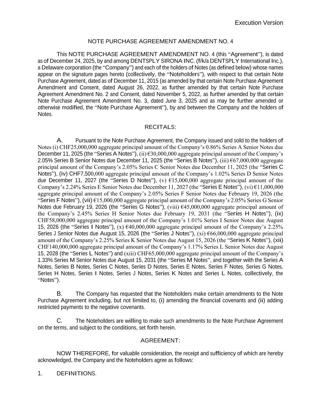 Execution Version NOTE PURCHASE AGREEMENT AMENDMENT NO. 4 This NOTE PURCHASE AGREEMENT AMENDMENT NO. 4 (this “Agreement”), is dated as of December 24, 2025, by and among DENTSPLY SIRONA INC. (f/k/a DENTSPLY International Inc.), a Delaware corporation (the “Company”) and each of the holders of Notes (as defined below) whose names appear on the signature pages hereto (collectively, the “Noteholders”), with respect to that certain Note Purchase Agreement, dated as of December 11, 2015 (as amended by that certain Note Purchase Agreement Amendment and Consent, dated August 26, 2022, as further amended by that certain Note Purchase Agreement Amendment No. 2 and Consent, dated November 5, 2022, as further amended by that certain Note Purchase Agreement Amendment No. 3, dated June 3, 2025 and as may be further amended or otherwise modified, the “Note Purchase Agreement”), by and between the Company and the holders of Notes. RECITALS: A. Pursuant to the Note Purchase Agreement, the Company issued and sold to the holders of Notes (i) CHF25,000,000 aggregate principal amount of the Company’s 0.86% Series A Senior Notes due December 11, 2025 (the “Series A Notes”), (ii) €30,000,000 aggregate principal amount of the Company’s 2.05% Series B Senior Notes due December 11, 2025 (the “Series B Notes”), (iii) €67,000,000 aggregate principal amount of the Company’s 2.05% Series C Senior Notes due December 11, 2025 (the “Series C Notes”), (iv) CHF7,500,000 aggregate principal amount of the Company’s 1.02% Series D Senior Notes due December 11, 2027 (the “Series D Notes”), (v) €15,000,000 aggregate principal amount of the Company’s 2.24% Series E Senior Notes due December 11, 2027 (the “Series E Notes”), (vi) €11,000,000 aggregate principal amount of the Company’s 2.05% Series F Senior Notes due February 19, 2026 (the “Series F Notes”), (vii) €15,000,000 aggregate principal amount of the Company’s 2.05% Series G Senior Notes due February 19, 2026 (the “Series G Notes”), (viii) €45,000,000 aggregate principal amount of the Company’s 2.45% Series H Senior Notes due February 19, 2031 (the “Series H Notes”), (ix) CHF58,000,000 aggregate principal amount of the Company’s 1.01% Series I Senior Notes due August 15, 2026 (the “Series I Notes”), (x) €40,000,000 aggregate principal amount of the Company’s 2.25% Series J Senior Notes due August 15, 2026 (the “Series J Notes”), (xi) €66,000,000 aggregate principal amount of the Company’s 2.25% Series K Senior Notes due August 15, 2026 (the “Series K Notes”), (xii) CHF140,000,000 aggregate principal amount of the Company’s 1.17% Series L Senior Notes due August 15, 2028 (the “Series L Notes”) and (xiii) CHF65,000,000 aggregate principal amount of the Company’s 1.33% Series M Senior Notes due August 15, 2031 (the “Series M Notes”, and together with the Series A Notes, Series B Notes, Series C Notes, Series D Notes, Series E Notes, Series F Notes, Series G Notes, Series H Notes, Series I Notes, Series J Notes, Series K Notes and Series L Notes, collectively, the “Notes”). B. The Company has requested that the Noteholders make certain amendments to the Note Purchase Agreement including, but not limited to, (i) amending the financial covenants and (ii) adding restricted payments to the negative covenants. C. The Noteholders are willing to make such amendments to the Note Purchase Agreement on the terms, and subject to the conditions, set forth herein. AGREEMENT: NOW THEREFORE, for valuable consideration, the receipt and sufficiency of which are hereby acknowledged, the Company and the Noteholders agree as follows: 1. DEFINITIONS.