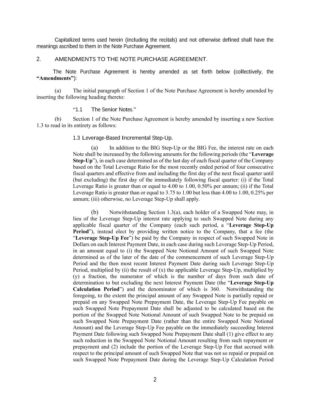 2 Capitalized terms used herein (including the recitals) and not otherwise defined shall have the meanings ascribed to them in the Note Purchase Agreement. 2. AMENDMENTS TO THE NOTE PURCHASE AGREEMENT. The Note Purchase Agreement is hereby amended as set forth below (collectively, the “Amendments”): (a) The initial paragraph of Section 1 of the Note Purchase Agreement is hereby amended by inserting the following heading thereto: “1.1 The Senior Notes.” (b) Section 1 of the Note Purchase Agreement is hereby amended by inserting a new Section 1.3 to read in its entirety as follows: 1.3 Leverage-Based Incremental Step-Up. (a) In addition to the BIG Step-Up or the BIG Fee, the interest rate on each Note shall be increased by the following amounts for the following periods (the “Leverage Step-Up”), in each case determined as of the last day of each fiscal quarter of the Company based on the Total Leverage Ratio for the most recently ended period of four consecutive fiscal quarters and effective from and including the first day of the next fiscal quarter until (but excluding) the first day of the immediately following fiscal quarter: (i) if the Total Leverage Ratio is greater than or equal to 4.00 to 1.00, 0.50% per annum; (ii) if the Total Leverage Ratio is greater than or equal to 3.75 to 1.00 but less than 4.00 to 1.00, 0.25% per annum; (iii) otherwise, no Leverage Step-Up shall apply. (b) Notwithstanding Section 1.3(a), each holder of a Swapped Note may, in lieu of the Leverage Step-Up interest rate applying to such Swapped Note during any applicable fiscal quarter of the Company (each such period, a “Leverage Step-Up Period”), instead elect by providing written notice to the Company, that a fee (the “Leverage Step-Up Fee”) be paid by the Company in respect of such Swapped Note in Dollars on each Interest Payment Date, in each case during such Leverage Step-Up Period, in an amount equal to (i) the Swapped Note Notional Amount of such Swapped Note determined as of the later of the date of the commencement of such Leverage Step-Up Period and the then most recent Interest Payment Date during such Leverage Step-Up Period, multiplied by (ii) the result of (x) the applicable Leverage Step-Up, multiplied by (y) a fraction, the numerator of which is the number of days from such date of determination to but excluding the next Interest Payment Date (the “Leverage Step-Up Calculation Period”) and the denominator of which is 360. Notwithstanding the foregoing, to the extent the principal amount of any Swapped Note is partially repaid or prepaid on any Swapped Note Prepayment Date, the Leverage Step-Up Fee payable on such Swapped Note Prepayment Date shall be adjusted to be calculated based on the portion of the Swapped Note Notional Amount of such Swapped Note to be prepaid on such Swapped Note Prepayment Date (rather than the entire Swapped Note Notional Amount) and the Leverage Step-Up Fee payable on the immediately succeeding Interest Payment Date following such Swapped Note Prepayment Date shall (1) give effect to any such reduction in the Swapped Note Notional Amount resulting from such repayment or prepayment and (2) include the portion of the Leverage Step-Up Fee that accrued with respect to the principal amount of such Swapped Note that was not so repaid or prepaid on such Swapped Note Prepayment Date during the Leverage Step-Up Calculation Period