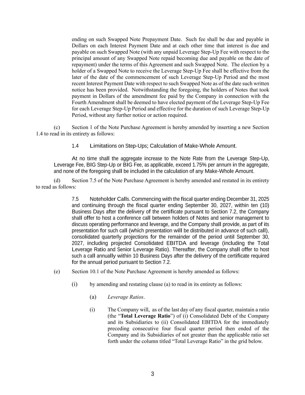3 ending on such Swapped Note Prepayment Date. Such fee shall be due and payable in Dollars on each Interest Payment Date and at each other time that interest is due and payable on such Swapped Note (with any unpaid Leverage Step-Up Fee with respect to the principal amount of any Swapped Note repaid becoming due and payable on the date of repayment) under the terms of this Agreement and such Swapped Note. The election by a holder of a Swapped Note to receive the Leverage Step-Up Fee shall be effective from the later of the date of the commencement of such Leverage Step-Up Period and the most recent Interest Payment Date with respect to such Swapped Note as of the date such written notice has been provided. Notwithstanding the foregoing, the holders of Notes that took payment in Dollars of the amendment fee paid by the Company in connection with the Fourth Amendment shall be deemed to have elected payment of the Leverage Step-Up Fee for each Leverage Step-Up Period and effective for the duration of such Leverage Step-Up Period, without any further notice or action required. (c) Section 1 of the Note Purchase Agreement is hereby amended by inserting a new Section 1.4 to read in its entirety as follows: 1.4 Limitations on Step-Ups; Calculation of Make-Whole Amount. At no time shall the aggregate increase to the Note Rate from the Leverage Step-Up, Leverage Fee, BIG Step-Up or BIG Fee, as applicable, exceed 1.75% per annum in the aggregate, and none of the foregoing shall be included in the calculation of any Make-Whole Amount. (d) Section 7.5 of the Note Purchase Agreement is hereby amended and restated in its entirety to read as follows: 7.5 Noteholder Calls. Commencing with the fiscal quarter ending December 31, 2025 and continuing through the fiscal quarter ending September 30, 2027, within ten (10) Business Days after the delivery of the certificate pursuant to Section 7.2, the Company shall offer to host a conference call between holders of Notes and senior management to discuss operating performance and leverage, and the Company shall provide, as part of its presentation for such call (which presentation will be distributed in advance of such call), consolidated quarterly projections for the remainder of the period until September 30, 2027, including projected Consolidated EBITDA and leverage (including the Total Leverage Ratio and Senior Leverage Ratio). Thereafter, the Company shall offer to host such a call annually within 10 Business Days after the delivery of the certificate required for the annual period pursuant to Section 7.2. (e) Section 10.1 of the Note Purchase Agreement is hereby amended as follows: (i) by amending and restating clause (a) to read in its entirety as follows: (a) Leverage Ratios. (i) The Company will, as of the last day of any fiscal quarter, maintain a ratio (the “Total Leverage Ratio”) of (i) Consolidated Debt of the Company and its Subsidiaries to (ii) Consolidated EBITDA for the immediately preceding consecutive four fiscal quarter period then ended of the Company and its Subsidiaries of not greater than the applicable ratio set forth under the column titled “Total Leverage Ratio” in the grid below.