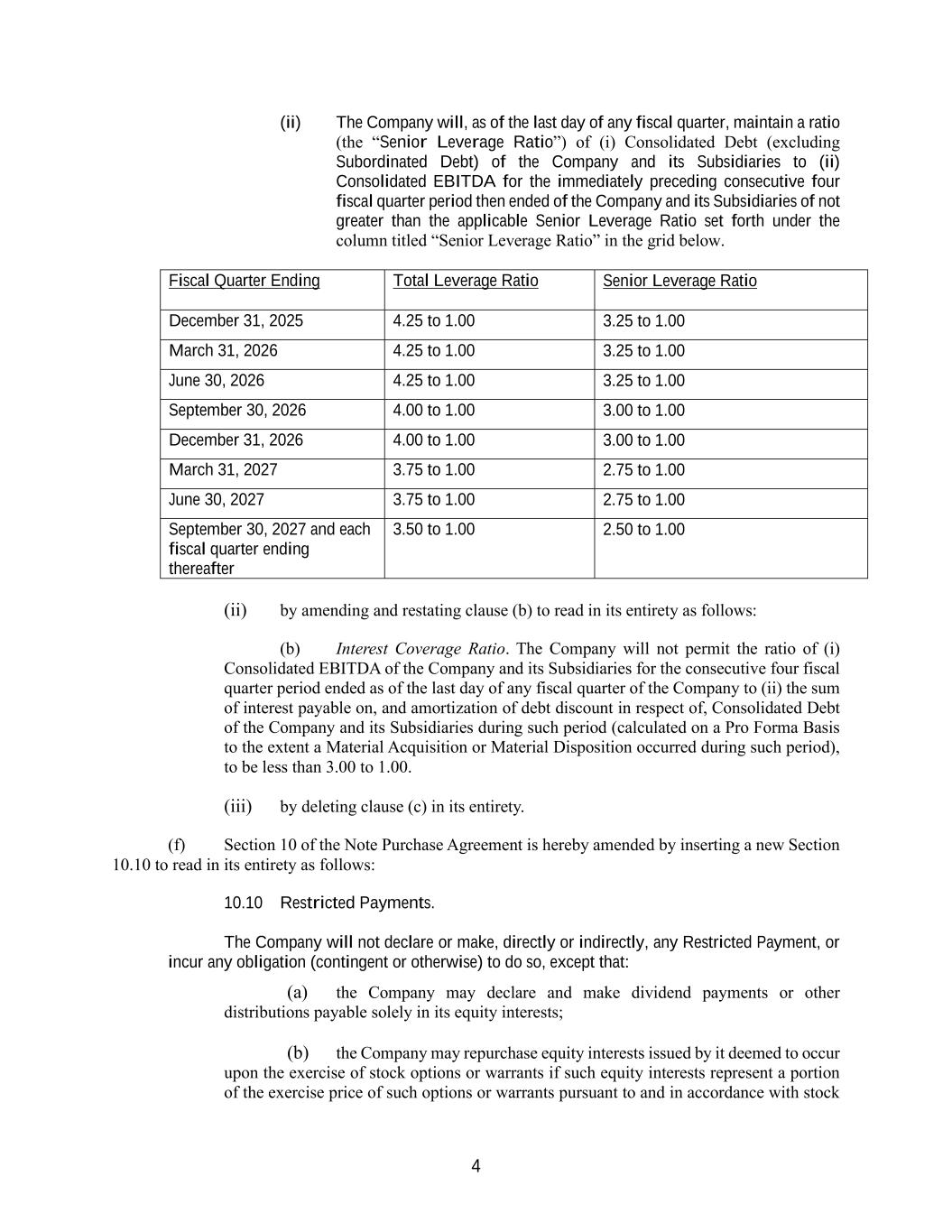 4 (ii) The Company will, as of the last day of any fiscal quarter, maintain a ratio (the “Senior Leverage Ratio”) of (i) Consolidated Debt (excluding Subordinated Debt) of the Company and its Subsidiaries to (ii) Consolidated EBITDA for the immediately preceding consecutive four fiscal quarter period then ended of the Company and its Subsidiaries of not greater than the applicable Senior Leverage Ratio set forth under the column titled “Senior Leverage Ratio” in the grid below. Fiscal Quarter Ending Total Leverage Ratio Senior Leverage Ratio December 31, 2025 4.25 to 1.00 3.25 to 1.00 March 31, 2026 4.25 to 1.00 3.25 to 1.00 June 30, 2026 4.25 to 1.00 3.25 to 1.00 September 30, 2026 4.00 to 1.00 3.00 to 1.00 December 31, 2026 4.00 to 1.00 3.00 to 1.00 March 31, 2027 3.75 to 1.00 2.75 to 1.00 June 30, 2027 3.75 to 1.00 2.75 to 1.00 September 30, 2027 and each fiscal quarter ending thereafter 3.50 to 1.00 2.50 to 1.00 (ii) by amending and restating clause (b) to read in its entirety as follows: (b) Interest Coverage Ratio. The Company will not permit the ratio of (i) Consolidated EBITDA of the Company and its Subsidiaries for the consecutive four fiscal quarter period ended as of the last day of any fiscal quarter of the Company to (ii) the sum of interest payable on, and amortization of debt discount in respect of, Consolidated Debt of the Company and its Subsidiaries during such period (calculated on a Pro Forma Basis to the extent a Material Acquisition or Material Disposition occurred during such period), to be less than 3.00 to 1.00. (iii) by deleting clause (c) in its entirety. (f) Section 10 of the Note Purchase Agreement is hereby amended by inserting a new Section 10.10 to read in its entirety as follows: 10.10 Restricted Payments. The Company will not declare or make, directly or indirectly, any Restricted Payment, or incur any obligation (contingent or otherwise) to do so, except that: (a) the Company may declare and make dividend payments or other distributions payable solely in its equity interests; (b) the Company may repurchase equity interests issued by it deemed to occur upon the exercise of stock options or warrants if such equity interests represent a portion of the exercise price of such options or warrants pursuant to and in accordance with stock